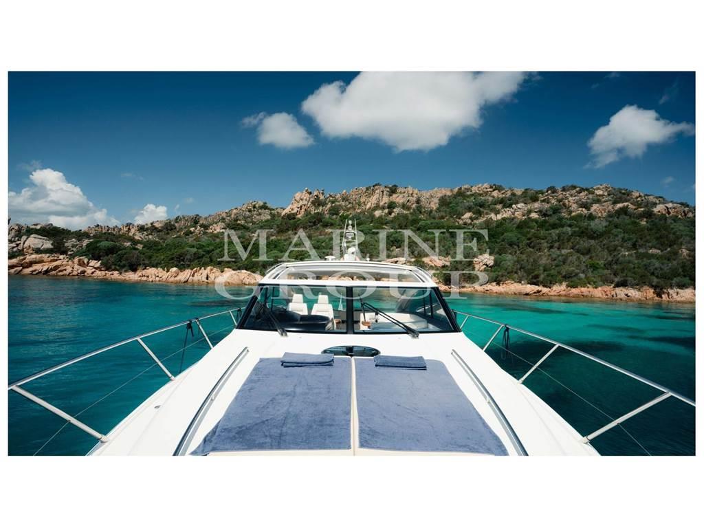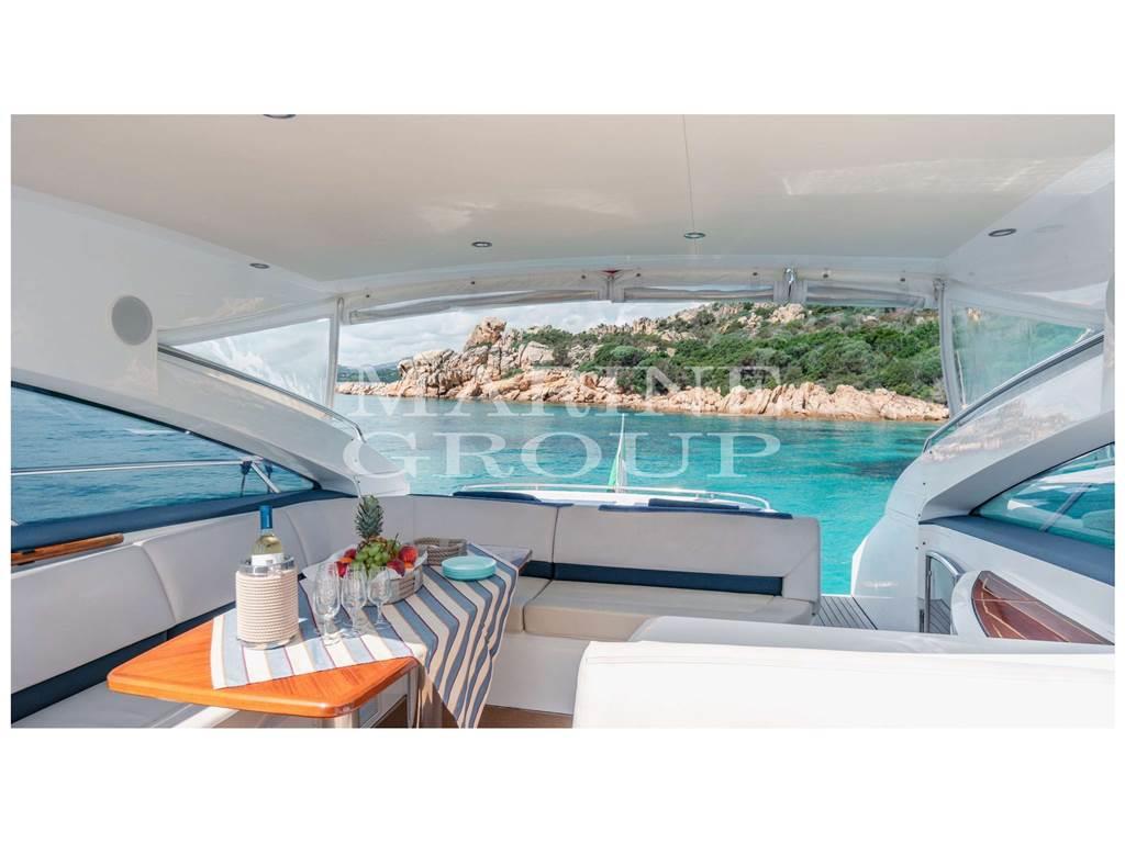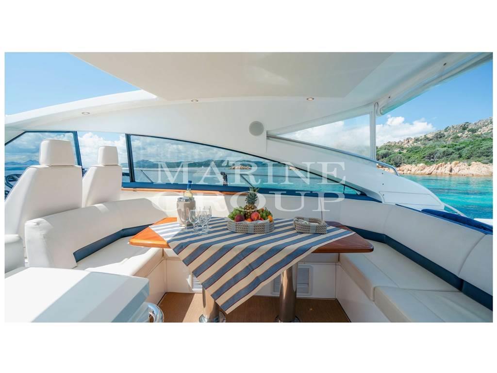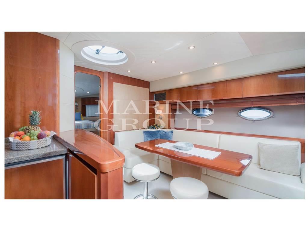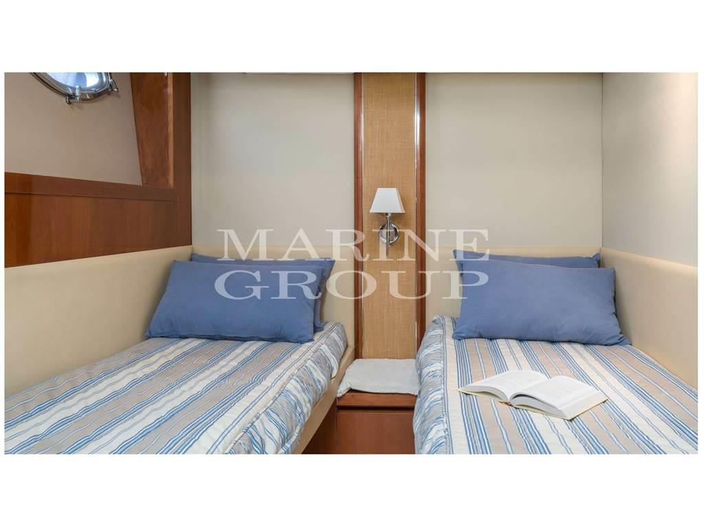 Interni in essenza di ciliegio chiaro lucido; parquet di Rovere; Ampia dinette con divano a "C" e tavolo centrale; Cucina a "L" completamente attrezzata; Cabina armatoriale a prua con bagno ensuite; Cabina di poppa con due letti singoli in piano; Seconda cabina di poppa con letti singoli a castello; Secondo servizio con box doccia.
