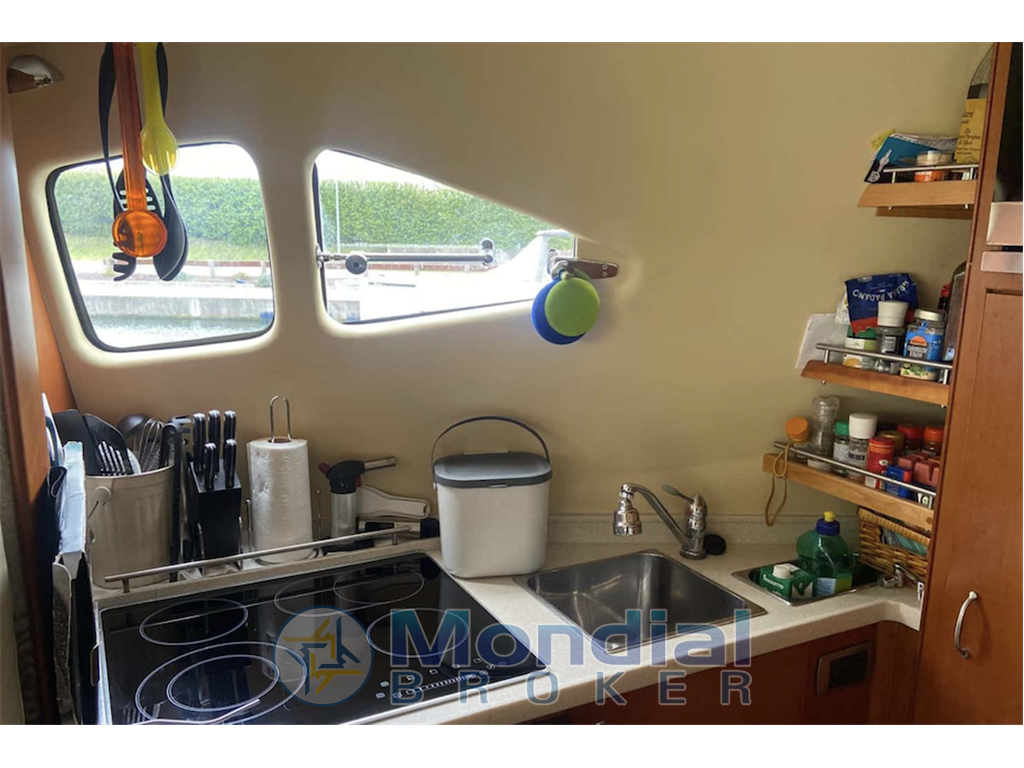 cabina armatoriale matrimoniale a centro barca, cabina ospiti VIP matrimoniale a prua, cabina ospiti doppia in piano, 3 bagni, cucina americana, doppia dinette, cabina marinaio, interni in ciliegio satinato e rivestimenti chiari.