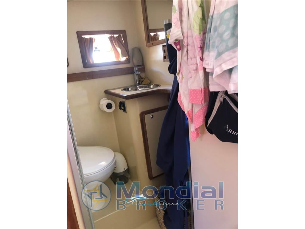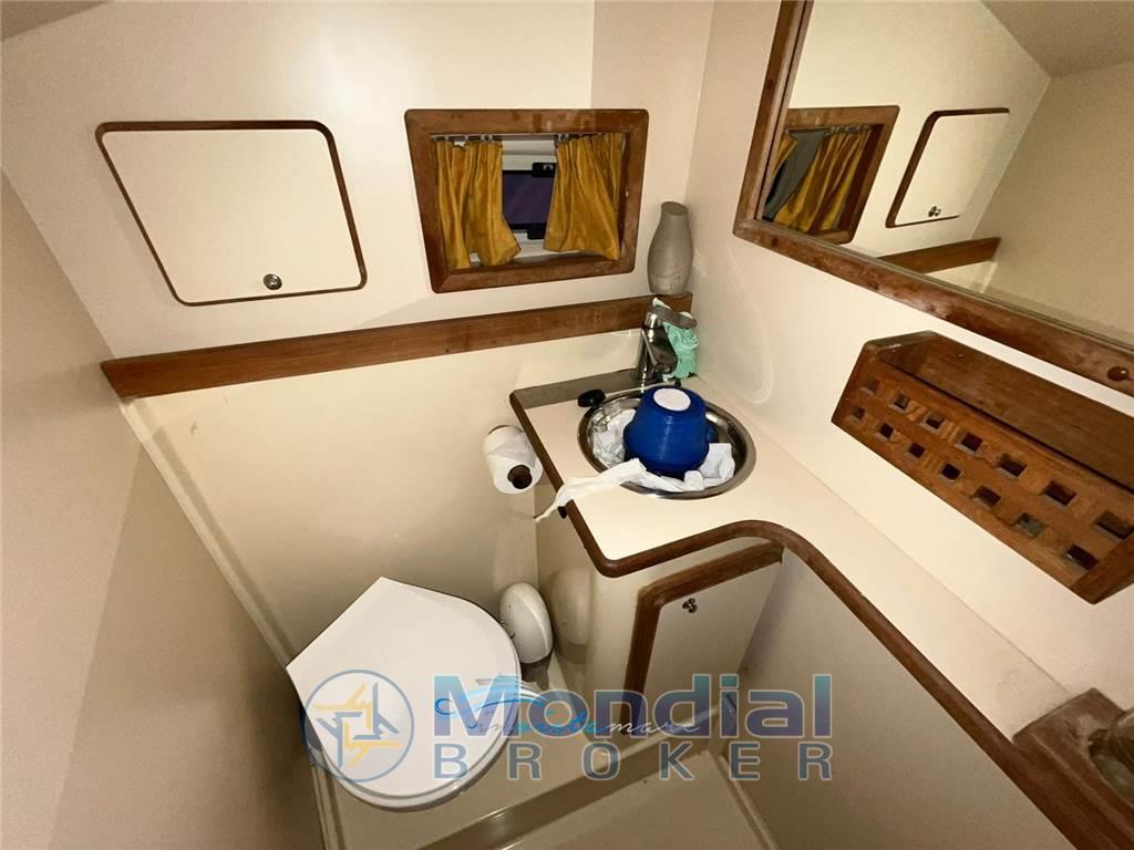Cucina (con fornelli sotto il sedile di guida a due fuochi Miele, lavello esterno in acciaio), Fornello (due fuochi), 2 Frigorifero esterno (Pozzetto frigo in coperta e frigo supplementare sottocoperta).