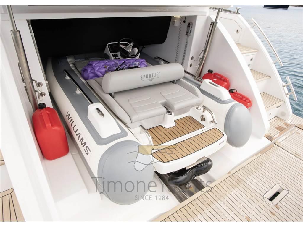 Camminamenti laterali in teak, Doccia esterna, Elica di prua - bow thruster, Fari fissi a poppa, Faro orientabile, Flap idraulici, Garage per tender, Hard top, Impianto antincendio, Indicatori Flaps, Lavaggio catena, Lavandino nel Pozzetto, Luci subacquee, Passerella, Pozzetto Teak, Presa 220V banchina, Presa acqua banchina, Stabilizzatori (Seakeeper NG9), Tavolo pozzetto, Tender (Williams 345), Winch tonneggio di poppa, Winch tonneggio di prua.