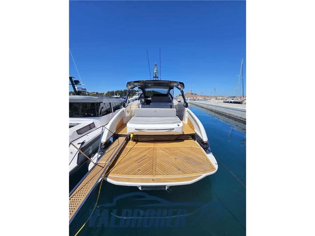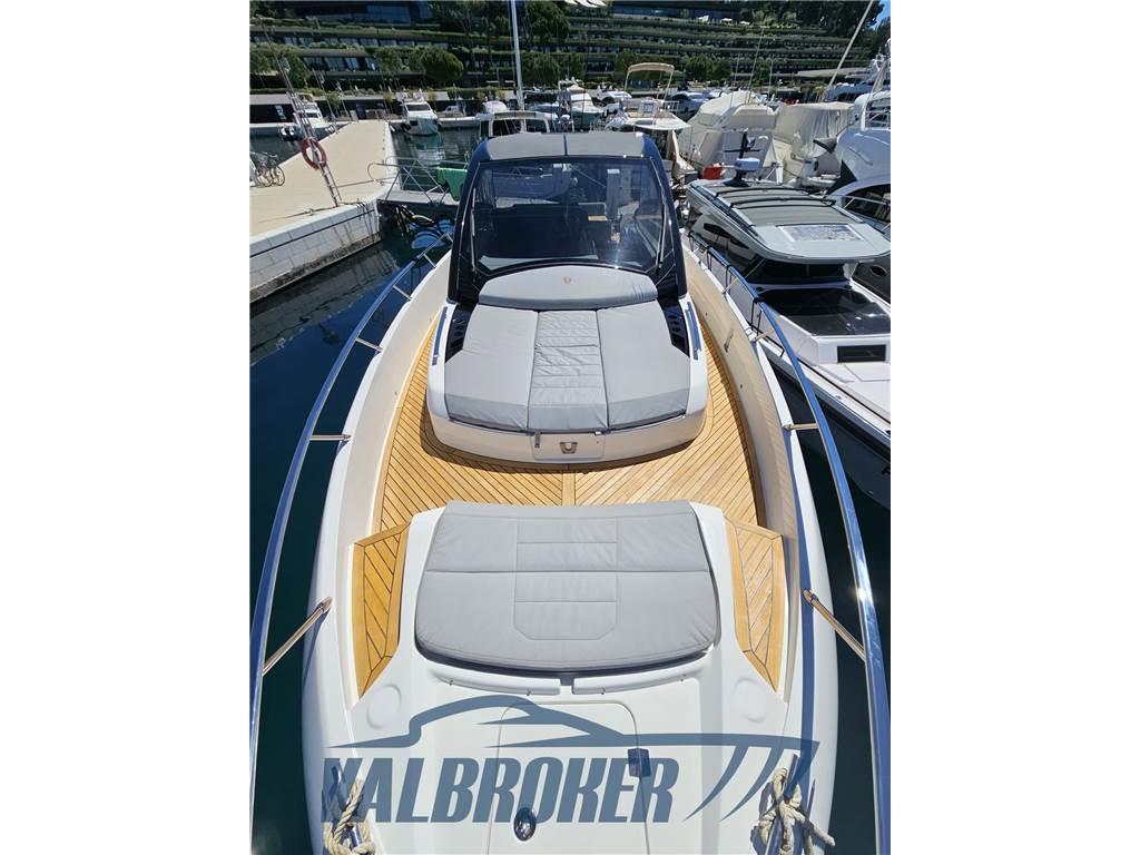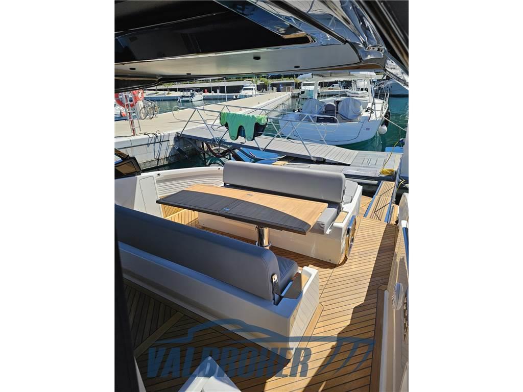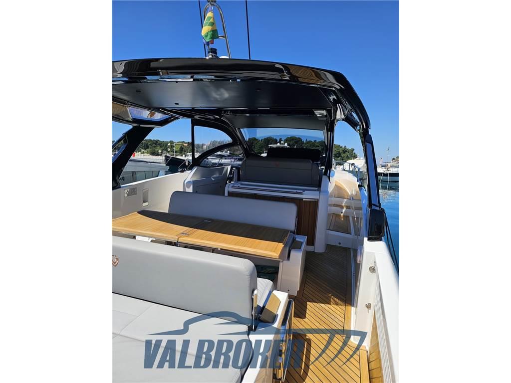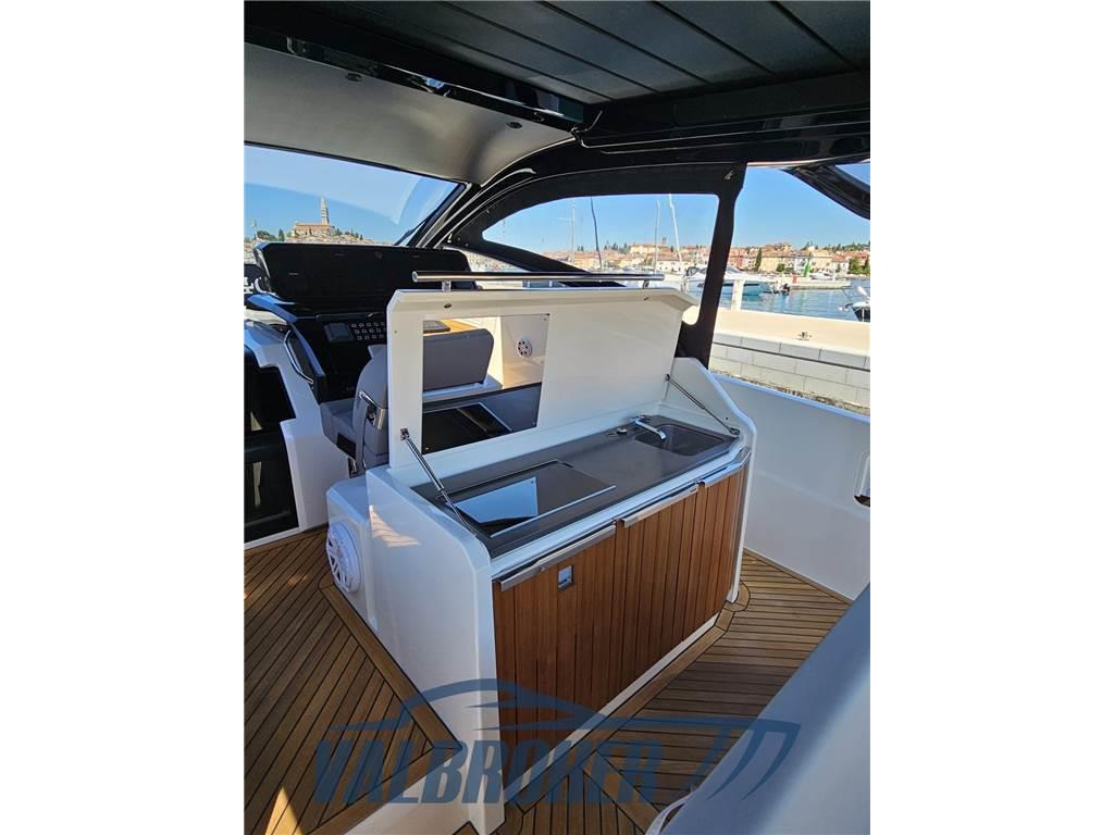 Linee accattivanti abbinate ad ampio parabrezza ed ottima circolazione dell'aria in pozzetto grazie all'Hard Top con apertura lamellare. Offre un'ampia cabina armatoriale a poppa a tutto baglio,un'elegante dinette a prua, trasformabile elettricamente in una vera e propria seconda cabina e due bagni. Gli interni sono moderni con materiali lussuosi e ricercati. Negli esterni l'eleganza del design si fonde perfettamente con lo spirito sportivo di questo nuovo esemplare 100% Made in Italy.