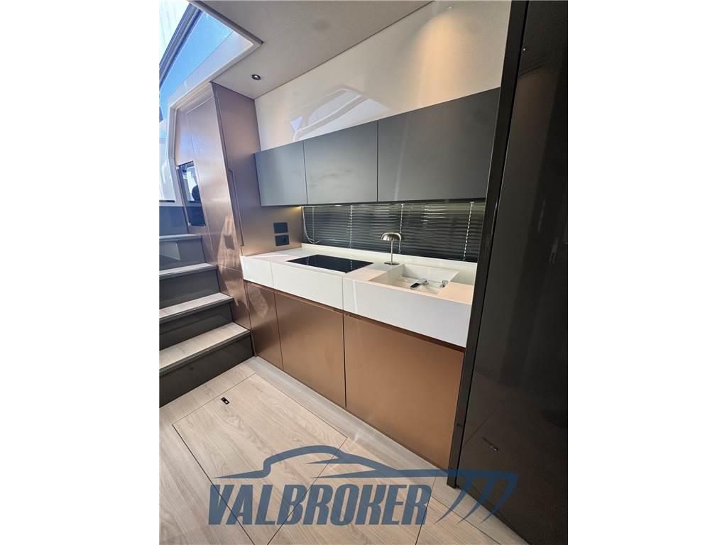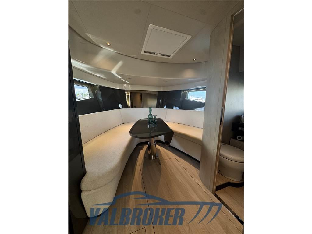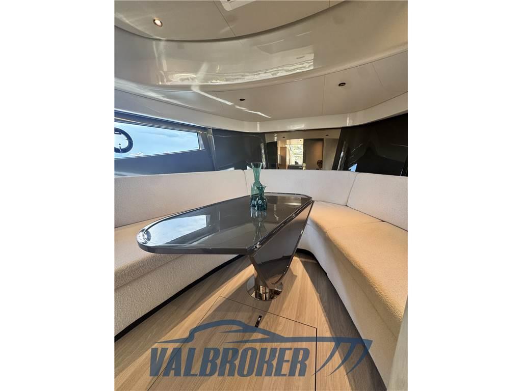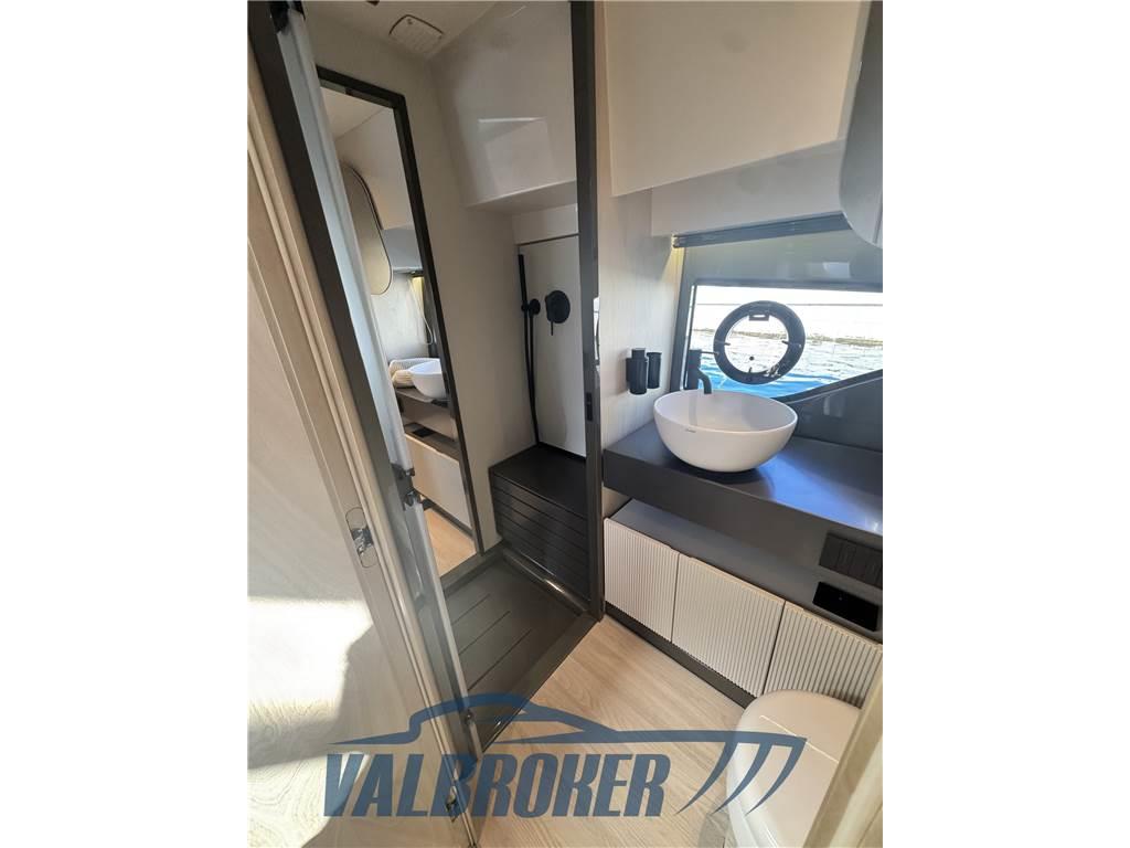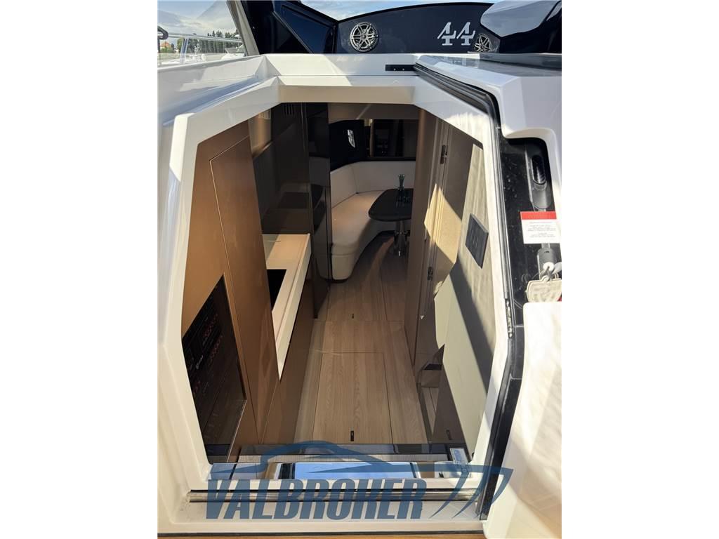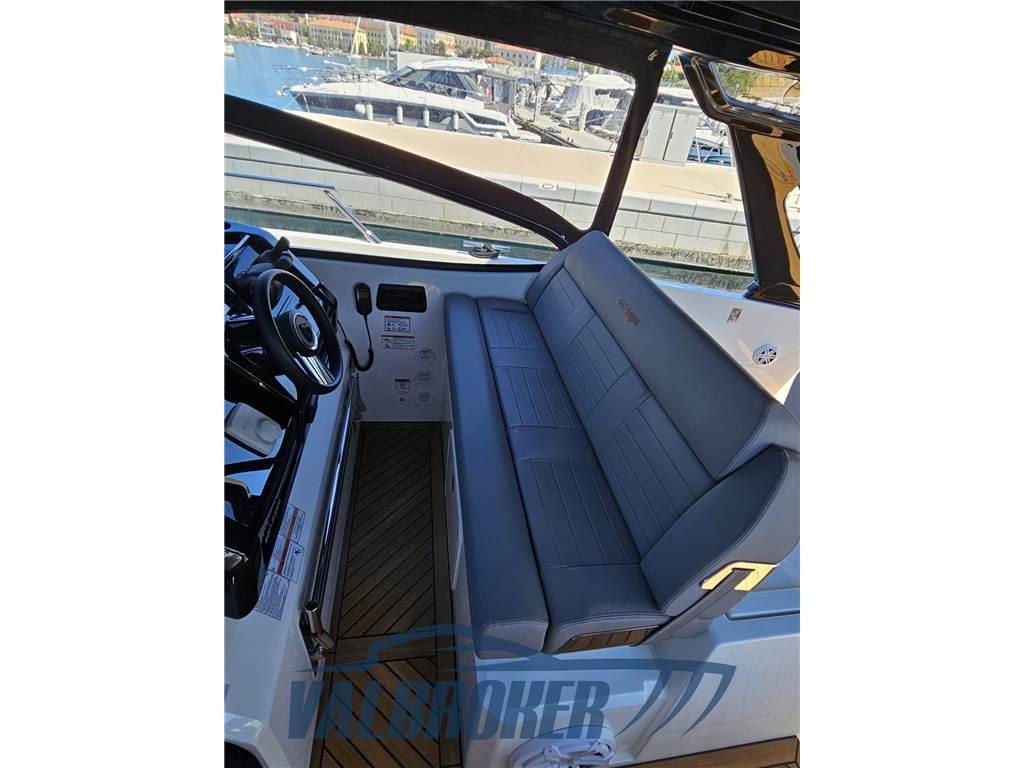 Linee accattivanti abbinate ad ampio parabrezza ed ottima circolazione dell'aria in pozzetto grazie all'Hard Top con apertura lamellare. Offre un'ampia cabina armatoriale a poppa a tutto baglio,un'elegante dinette a prua, trasformabile elettricamente in una vera e propria seconda cabina e due bagni. Gli interni sono moderni con materiali lussuosi e ricercati. Negli esterni l'eleganza del design si fonde perfettamente con lo spirito sportivo di questo nuovo esemplare 100% Made in Italy.