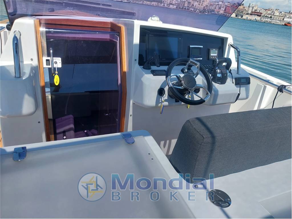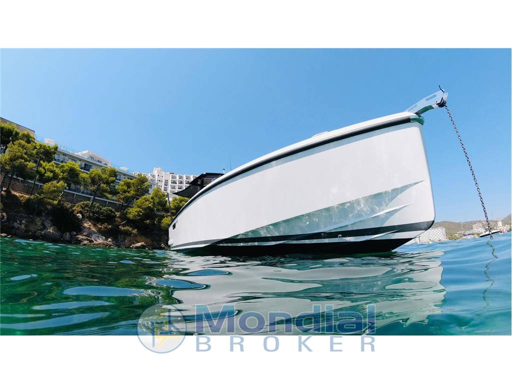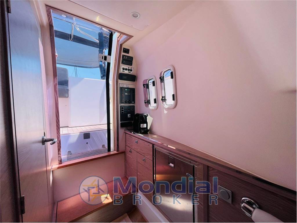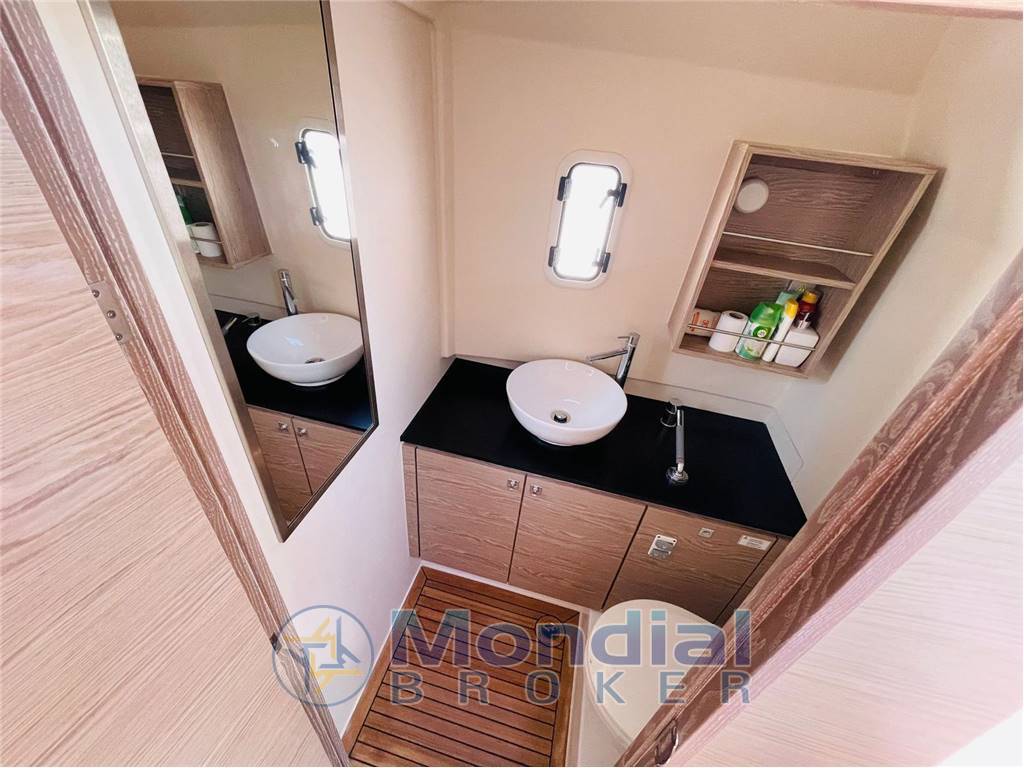 Engine Alarm, Bilge Alarm, Anchor (galvanized 10 kg with 50 m SS chain), Electric Engine Compartment Opening, Water pressure pump, Auto-Trim (Mercury Active Trim system), 5 Batteries (2x 90Ah (engine) + 3x 160Ah AGM (service)), 6 Folding cleats, Draining System, Tender Garage, Washbasin in the cockpit, Courtesy Lights, 2 Automatic Bilge Pump, Entry door (Sliding), Shorepower connector, cockpit table (with teak foldable wings + electric pedestal convertible into XL sunpad), 2 guard rails with gates, Horn, T-Top (painted tubular steal and fiberglass).