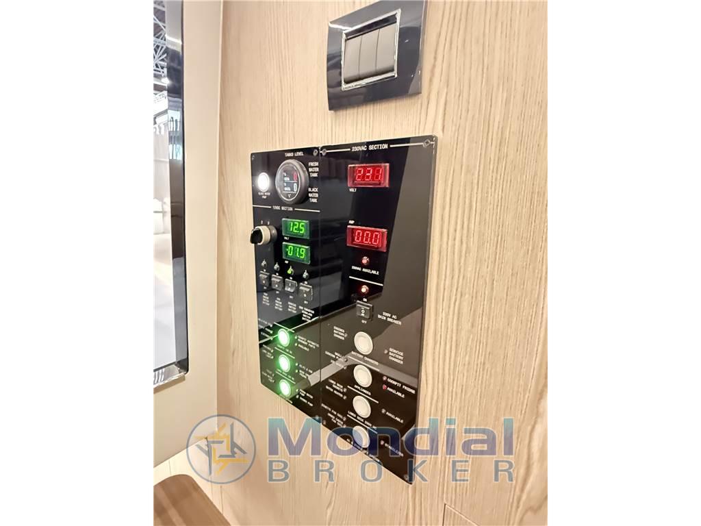 Allarme motore, Autoclave, Batterie, Bussola, Caricabatterie, Cavo corrente di banchina, Comando motori elettronico, Ecoscandaglio, Elica di prua - bow thruster, Flap elettrici, Hard top, Indicatori Flaps, Luci di cortesia, Luci di navigazione, Piattaforma, Plotter con antenna GPS, Salpa Ancore Elettrico, Scaletta da bagno, Tromba