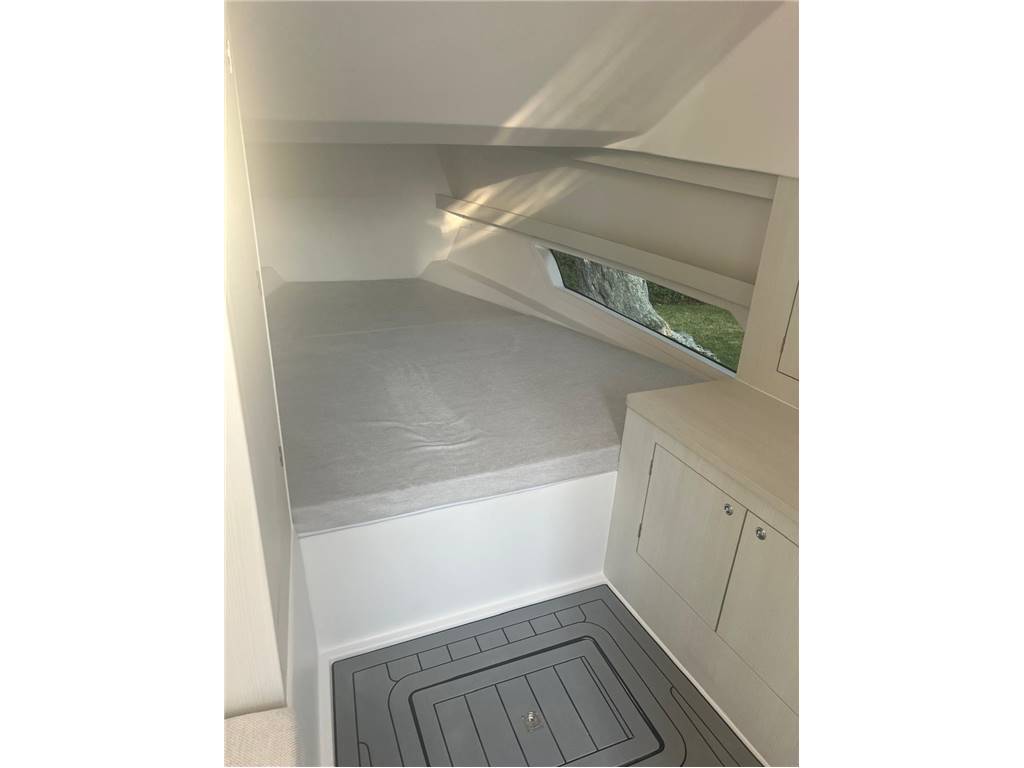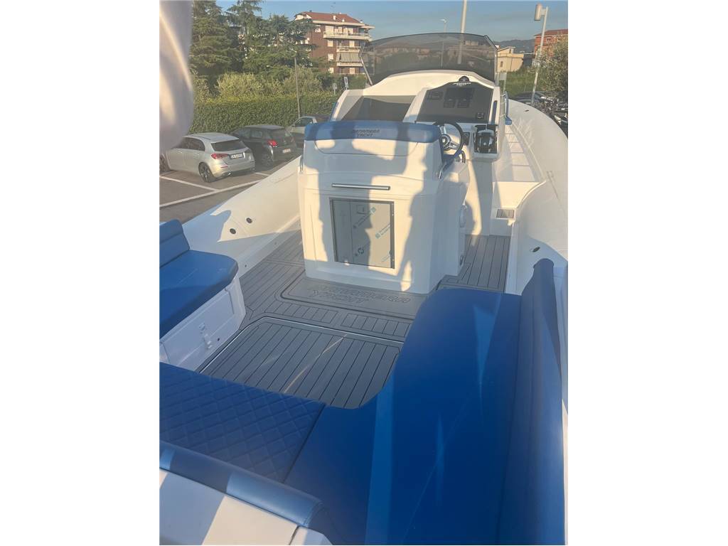 Elica di prua, autoclave, verricello elettrico con comando a prua, conta catena, doccetta esterna a prua e poppa, , cuscineria prendisole completa, tendalini, telo copri consolle, mobile esterno con fornello a gas – lavello - frigo, scaletta bagno a scomparsa, maniglie di risalita mare, caricabatterie + impianto 220V tavolo di poppa elettrico con comandi, luci di cortesia pozzetto, prese USB, Tubolari versione Carbon Look