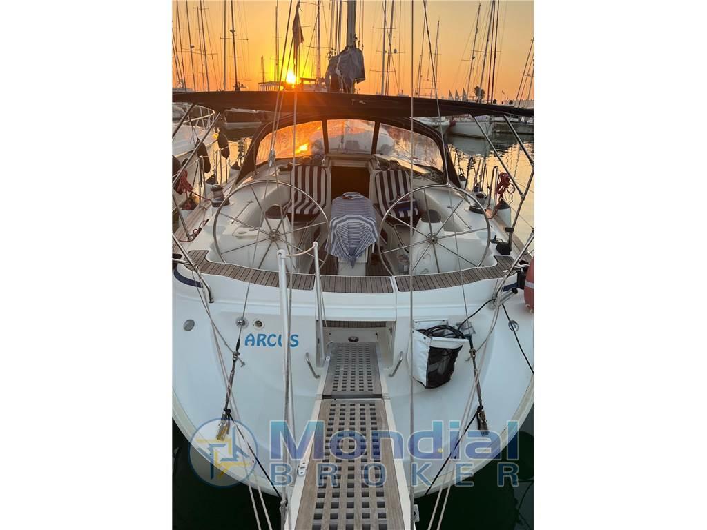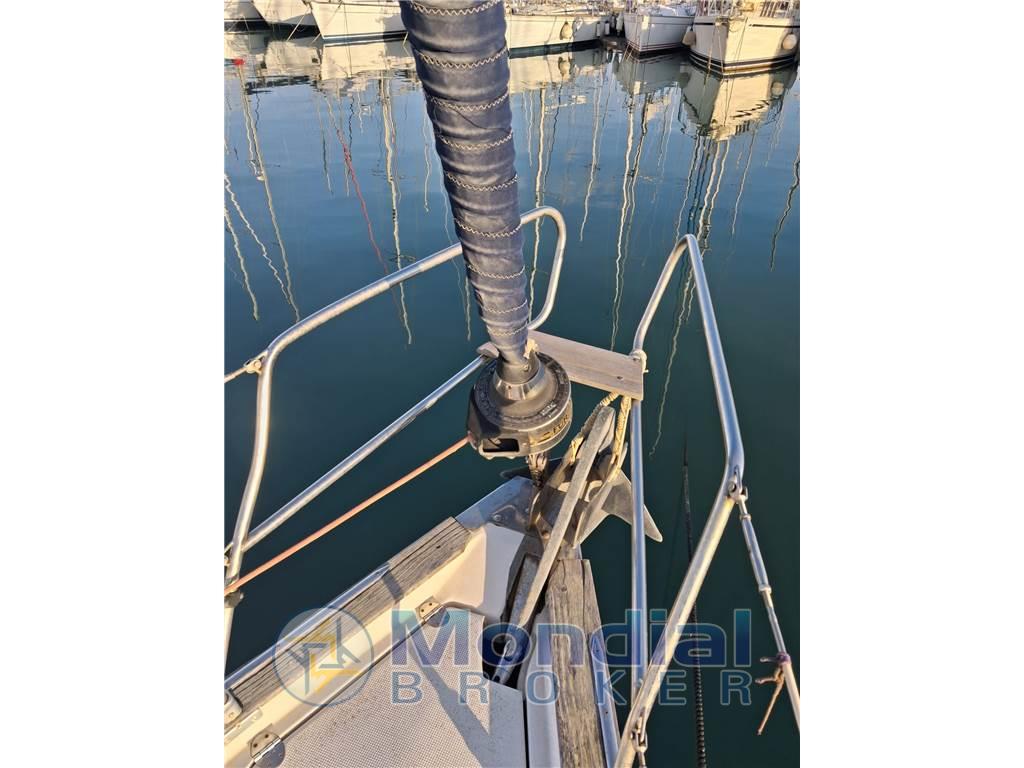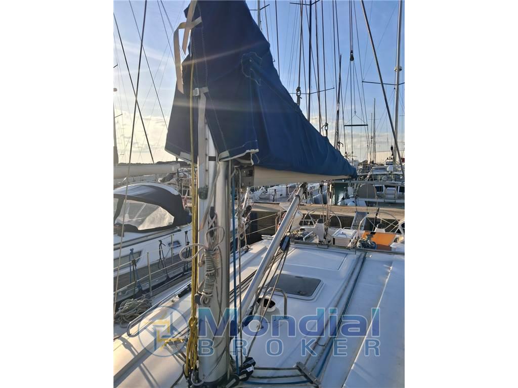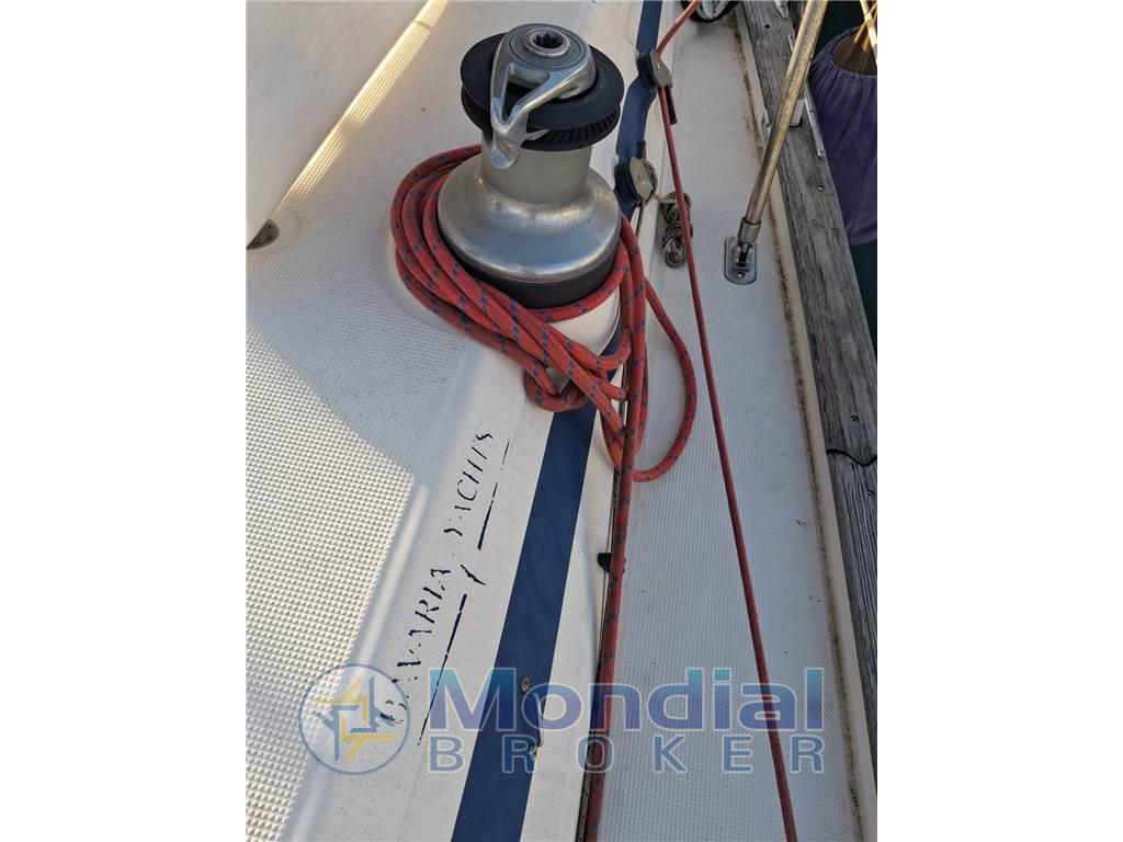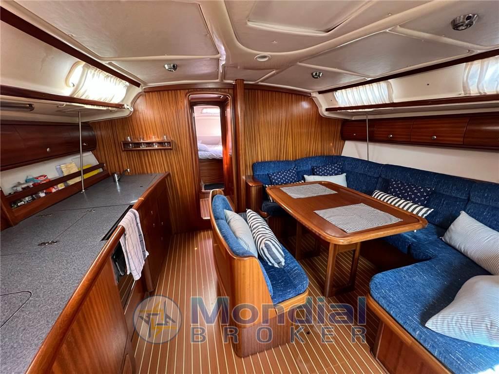 Layout : cabina armatoriale matrimoniale a prua con bagno, cabina ospiti doppia con letti a castello sempre a prua, 2 cabine ospiti matrimoniali a poppa, secondo bagno in dinette, dinette con divano a L più seduta e tavolo, angolo cottura con cucina a gas basculante 3 fuochi con forno, doppio lavandino, frigo a pozzetto, tavolo da carteggio con strumentazione, comodo pozzetto in teak con tavolo, doppio timone a ruota.
