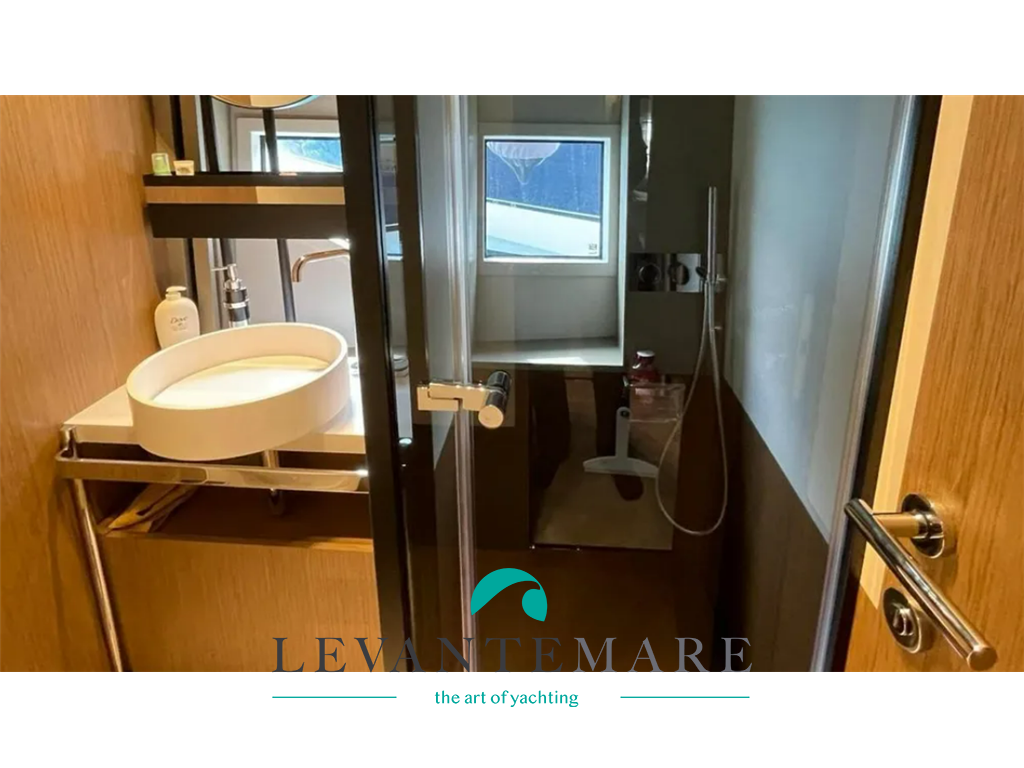 LOWER DECK – zona notte con quattro cabine: a centro barca, la suite armatoriale sfrutta, sui suoi 20m², tutto il baglio del Ferretti 720, ci sono poi due cabine doppie con due letti separati, che condividono un bagno con funzionalità anche di bagno a giorno.