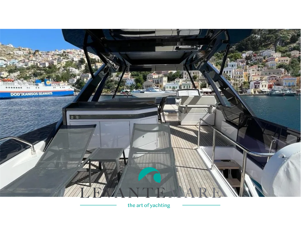 FLYBRIDGE – realizzato in fibra di carbonio e materiali compositi, è sormontato da un hard top con lamelle apribili. Questa zona vanta una superficie di 30 mq concepita per il relax e la convivialità, come testimoniano il solarium a prua e la dinette, servita da un’area bar, a poppa. A prua una tradizionale cabina Vip a “V”, con proprio bagno e doccia separata. La zona esterna di prua offre spazi vivibili grandi e intercambiabili, mentre la spiaggetta di poppa, una vera terrazza sul mare, è in grado di ospitare un tender di 3,95 metri.