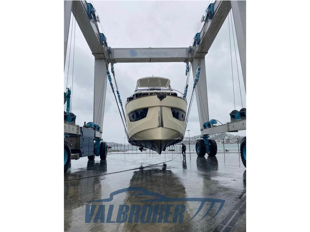 Fly equipaggiato con 2x D8 800 Volvo Penta. Ampi prendisole sul fly e a prua, raggiungibili con facilità e massima sicurezza. Postazione di comando centrale sul fly, un comodo mobile bar, un tavolo da pranzo con due divani e una terrazza panoramica e protetta; a prua un prendisole raggiungibile grazie a passaggi laterali larghi.La postazione di comando è ergonomica e dotata di grande visibilità anche da seduti con porta laterale. Il ponte inferiore prevede due cabine matrimoniali e una terza cabina doppia con bagno. Tutti i bagni sono provvisti di bidet. Tutti le aree sottocoperta sono dotati di porte scorrevoli, per ridurre al massimo gli ingombri e ottimizzare la vivibilità degli ambienti. FULL OPTIONAL: aria condizionata caldo/freddo, elica di prua, joystick, piattaforma idraulica, antenna satellitare, colorazione speciale scafo CHAMPAGNE, terza stazione di pilotaggio.