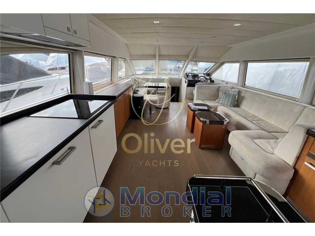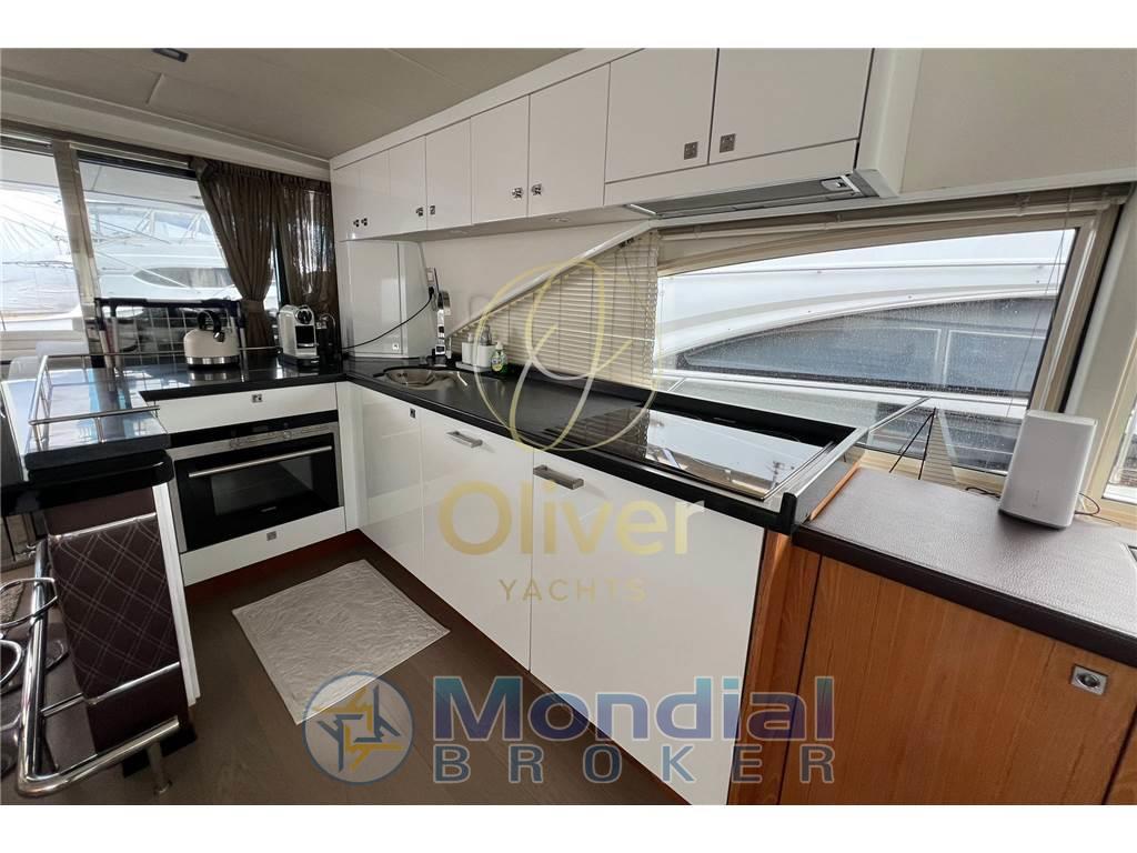 Il salone, sullo stesso livello del ponte di poppa, è luminoso, accogliente e perfettamente collegato agli spazi esterni: con le porte aperte si crea un unico grande living continuo. La cucina è completamente attrezzata, con frigorifero, freezer, lavastoviglie e lavatrice, pensata per vivere a bordo senza rinunce.