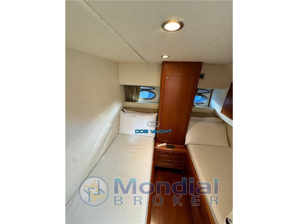 Disposizione interni ed esterni: 3 CABINE, 2 BAGNI, CABINA MARINAIO A PRUA: cabina armatoriale a prua con locale WC separato e cabina doccia con ingresso indipendente, divano , cucina contrapposta con frigo ISOTHERM SN4150349, lavabo, n* 4 piastre SMEG, forno a micro onde SMEG, I cabina ospiti con letti in piano, locale WC contrapposto separato, II cabina ospiti a poppa con letto matrimoniale , locale WC separato e comando stereo FUSION indipendente; ampio prendisole di poppa, pozzetto con divani corredati di tappezzerie e tavolo, plancia comando con seduta pilota e co pilota, ampio prendisole di prua.