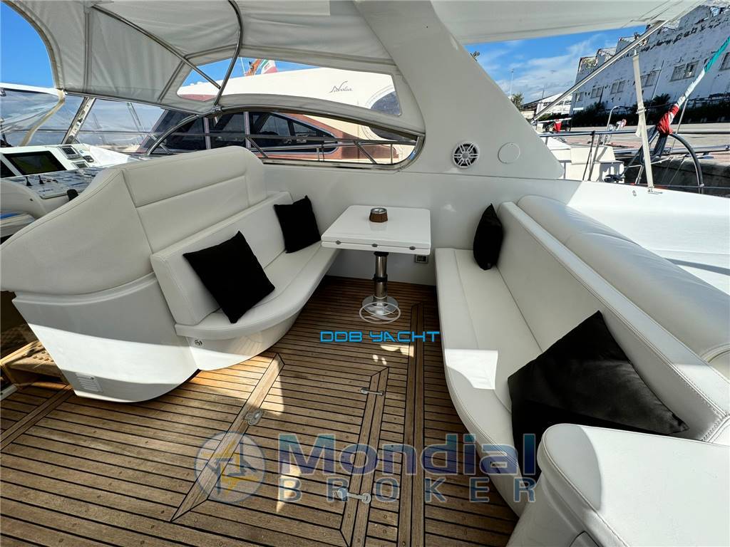 Dotazione armamento e accessori: dotazioni di bordo, ROLL BAR in VTR con tendalino parasole con arcata in acciaio anteriore e posteriore, faro applicato su roll bar MARINE SPORT con pulsantiera direzionale, tendaggio privacy a poppa, passerella idraulica, pedana di poppa rivestita in TEAK, mobile living in pozzetto con lavabo, frigo ISOTHERM, piastre in vetroceramica, telo copri cuscini prua.