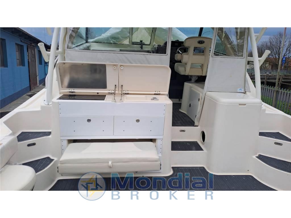 Pursuit 345 OS Offshore del 2011 con due Yamaha da 350hp con 380 ore . Ampio open space di prua, seconda cabina sotto baglio, cucina , attrezzata , WC elettrico con serbatoio acque nere in locale separato. Generatore, Aria Condizionata, Radar, Elica di Prua, Flaps, Doppio Plotter GPS Raymarine, Eco, Vhf, Vasche varie per vivo e pescato, innumerevoli portacanne. Frigorifero interno ( Nuovo ) , Piastra elettrica, Microonde, Verricello elettrico, Carica batterie e presa banchina 220 V, Luci Sub,. Flexi Teak in pozzetto e Teak naturale in interno, Teli chiusura Hard Top . Fari di pozzetto. Nel 2025 è stata riverniciata completamente l’opera morta e sostituite tutte le tappezzerie interne comprese le cuscinerie.