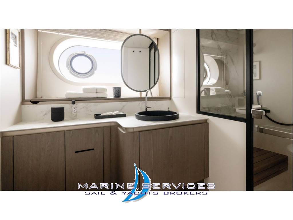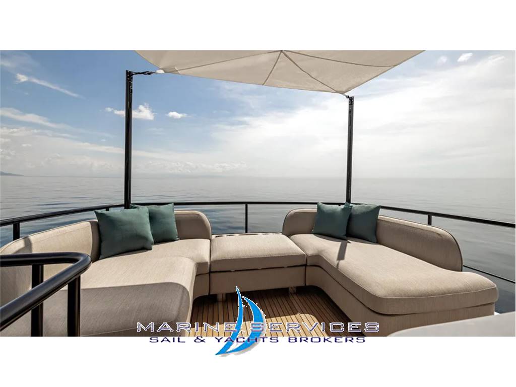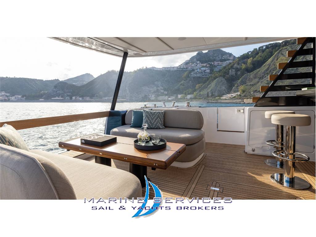 Principali Optionals oltre alle dotazioni standard  :Stabilizzatore Seakeeper 18, Elica di Poppa , Aria condizionata maggiorata ,Passerella idraulica telescopica a scomparsa , Desalinizzatore, Scafo , falchetta e specchio poppa verniciati , Ponte in Blu teak completo incluso camminamenti laterali e flybridge , Flybridge e pozzetto poppa attrezzato con wet bar e sgabelli   ,  Hard Top con tendalino ad apertura elettrica  , Cuscinerie e tendalini completi , Teli ombreggianti per zona  di prua e su fly con pali in carbonio amovibili , Cabina equipaggio allestita, Elettronica di navigazione Raymarine Platinum , Pacchetto audio Video upgrade e Kit antenna Starlink.