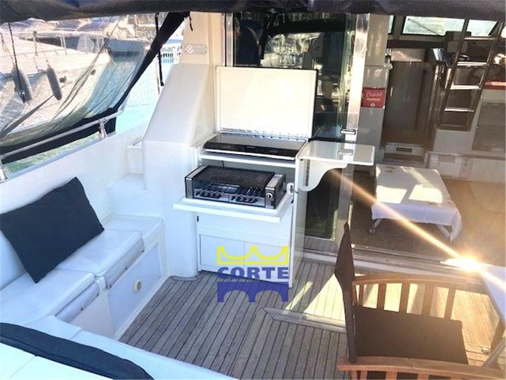 Allarme motore, Allarme sentina, Ancora (Bruce con 100 mt di catena), Antenna radar (riconoscimento), Autoclave, 5 Batterie (250 Ah (2020)), Bussola, Caricabatterie, Contamiglia, Doccia esterna (acqua calda/fredda), Doppia timoneria, 2 DSC vhf, 2 Ecoscandaglio (Garmin), Elica di poppa - stern thruster (Vetus (2020)), Elica di prua - bow thruster, Flap idraulici, 2 GPS (Garmin), Gruette per tender (passerella), Lavaggio catena, Luci di cortesia (led), Passerella (idraulica Opacmare), Piattaforma, Pilota automatico (Garmin con telecomando Wireless), Pompa di sentina automatica, Pompa di sentina elettrica, Porta ingresso, Pozzetto Teak, Presa 220V banchina, Presa acqua banchina, Radio VHF, Rollbar (sul fly), Salpa Ancore Elettrico (con telecomando), Scaletta da bagno, Supporto motore fuoribordo, Tavolo pozzetto, Tavolo Salone Abbattibile (trasformabile), Tromba, Winch tonneggio di prua