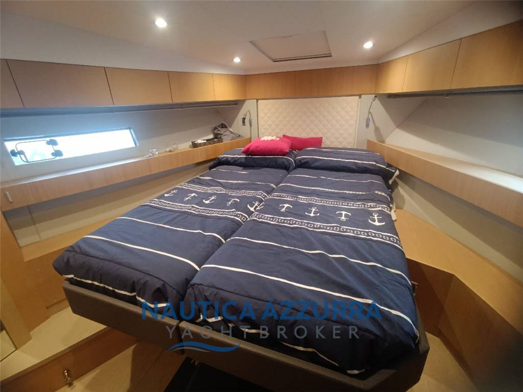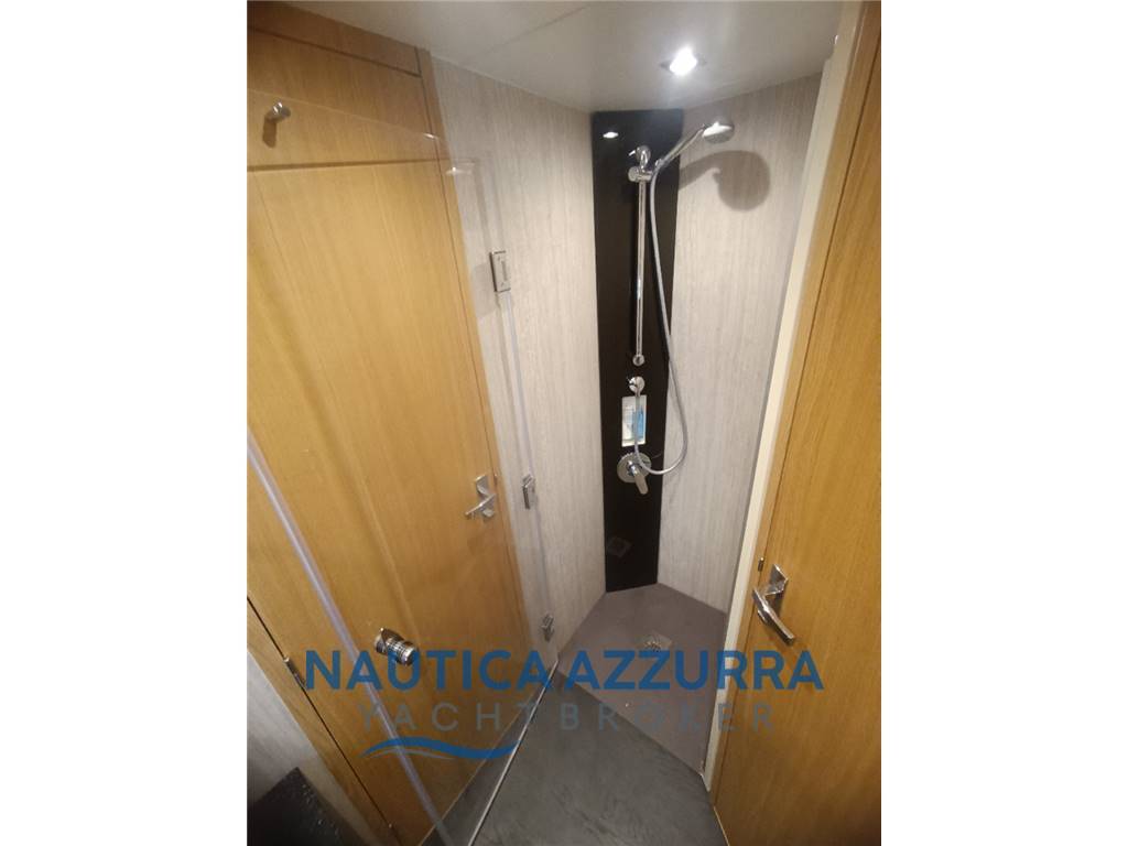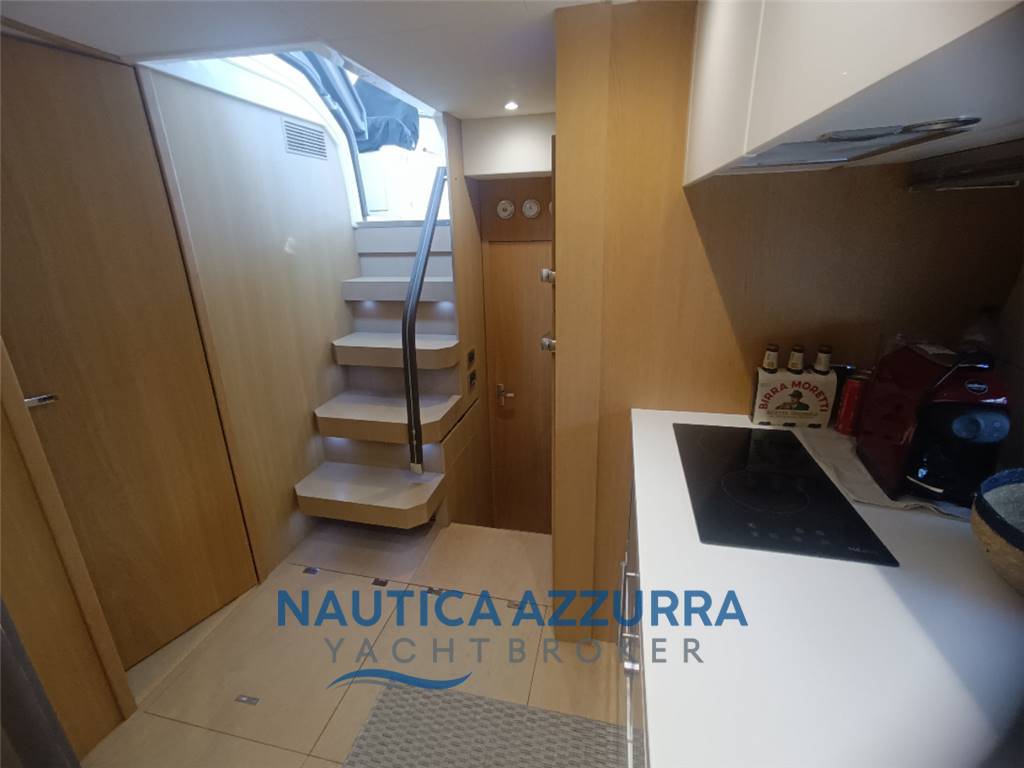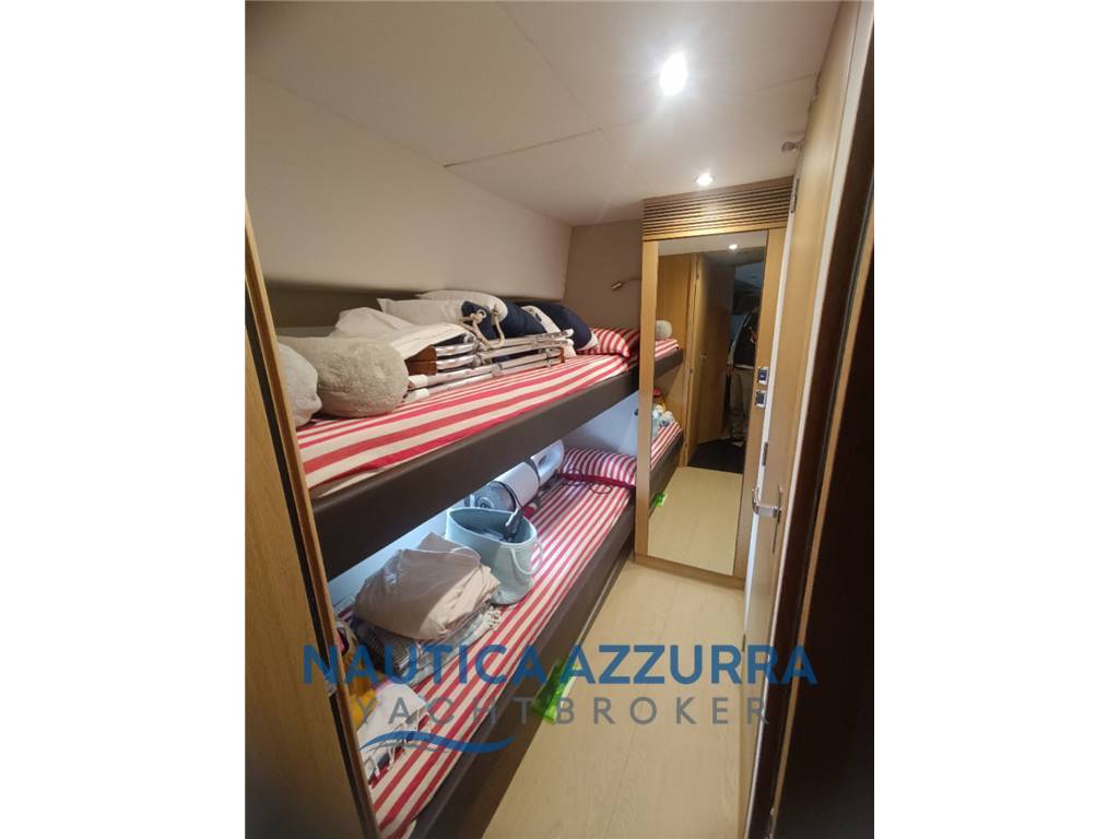 Interni in rovere - Versione tre cabine - Cucina attrezzata con piastra vetroceramica, frigo a colonna e dispensa scorrevole - Cabina armatoriale in centro barca con bagno e doccia separata - Cabina Vip a prua con letti singoli trasformabili in matrimoniale - Terza cabina con letti a castello - Bagno ospiti con doccia separata