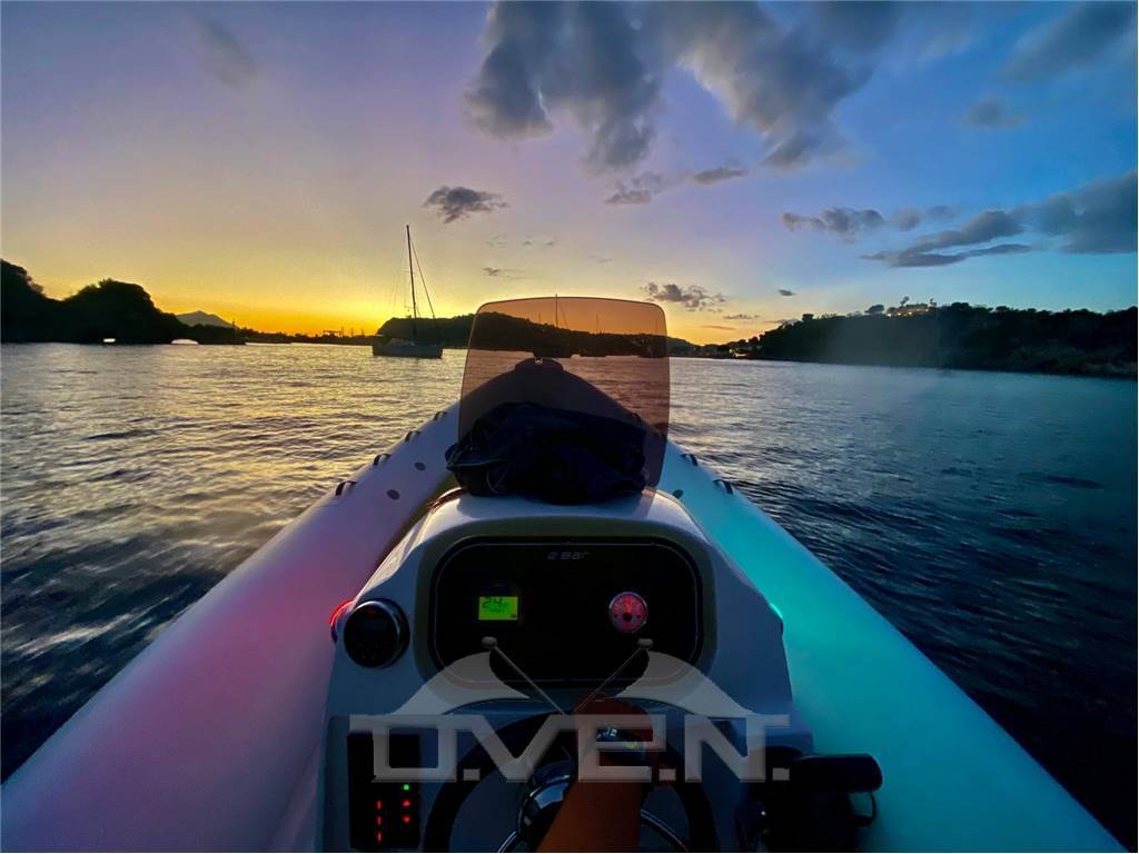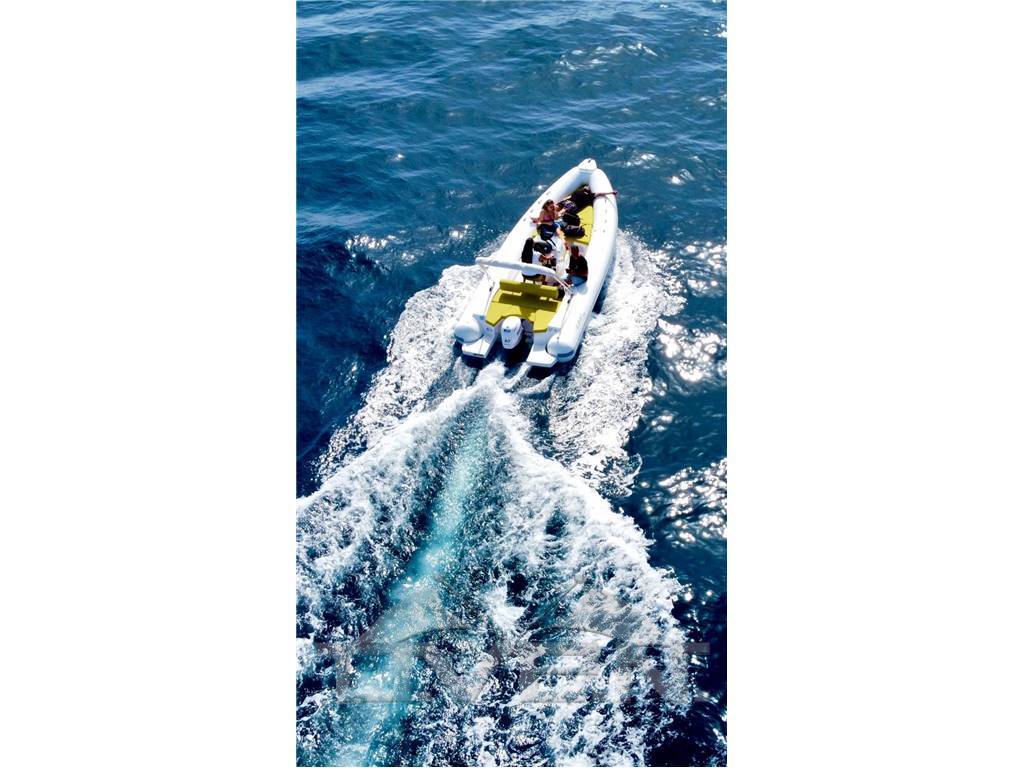 Il battello monta i seguenti accessori: rollar con Tendalino parasole SEDILMARE, più sportivo e slanciato rispetto al classico di serie, poi scaletta di risalita in acciaio inox, stereo bluetooth, doccia con autoclave nuovo montato estate 2025, manetta a chiesuola, tavolino centrale a prua.