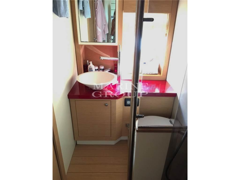 Interni in essenza di rovere; dinette con divano a C, cucina attrezzata con lavello fuochi ad induzione e frigo; cabina armatoriale a centro barca con bagno en suite con box doccia separato; cabina opsiti a prua con letto matrimoniale separabile in due letti singoli, secondo bagno completo di box doccia.