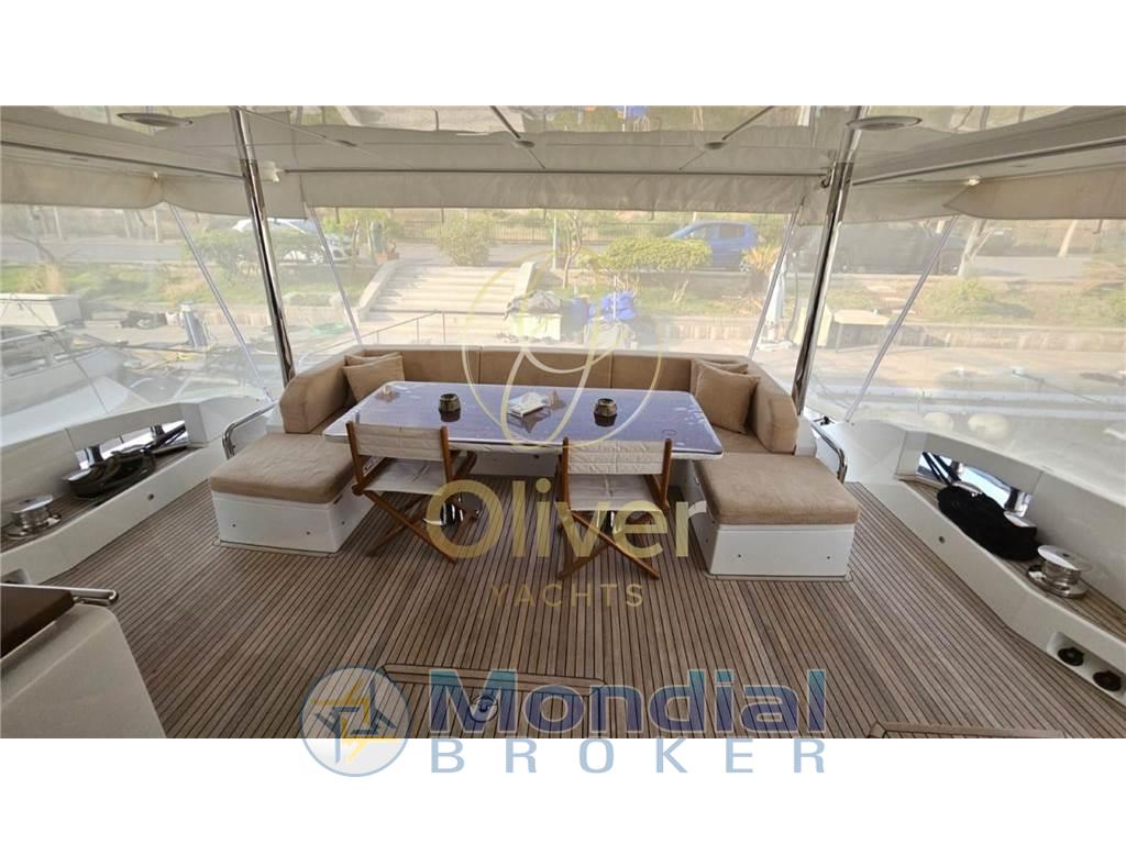 La prua della barca è altrettanto ben progettata, offrendo un'ampia area prendisole con cuscini e divani accoglienti, e un tavolo in teak regolabile in altezza, ideale per cene all'aperto o momenti di relax. L'intera area è pavimentata in teak, un materiale che aggiunge un tocco di eleganza e garantisce durabilità nel tempo. Il pozzetto a poppa è pensato per il massimo comfort e funzionalità, con un tavolo per 10 persone, sedie in teak, un barbecue Kenyon, frigorifero e fabbricatore di ghiaccio.