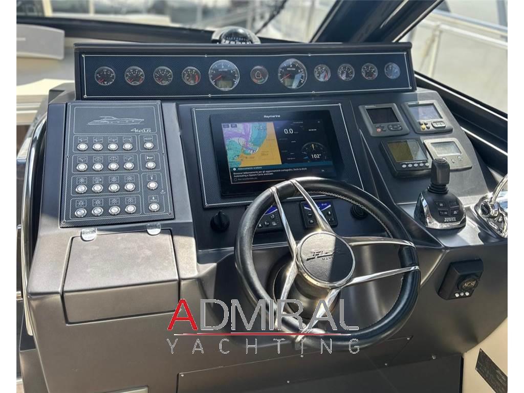 Timoneria situata a dritta, dotata di joystick per manovre facilitate (grazie ai motori IPS) e una chaise longue laterale per i passeggeri.