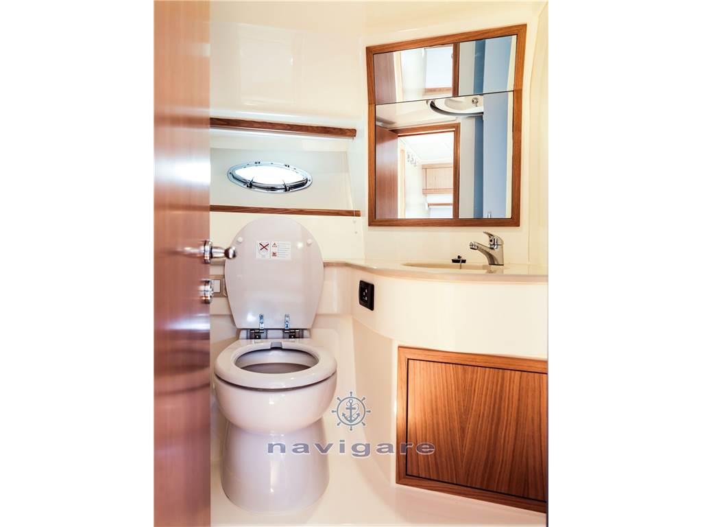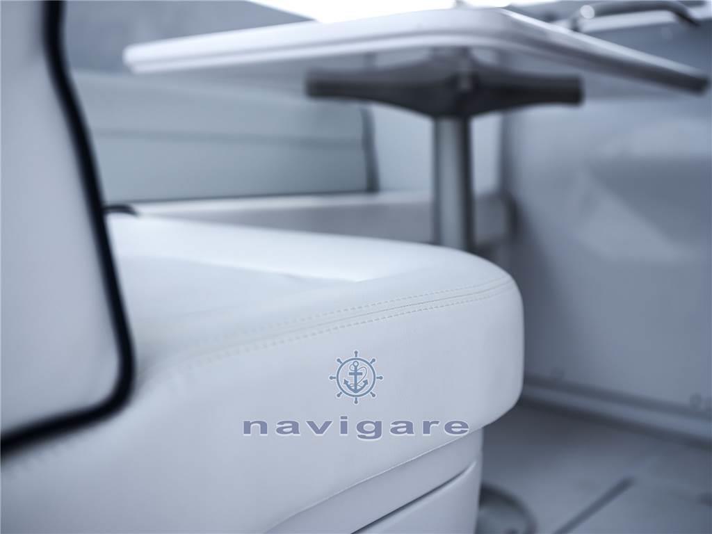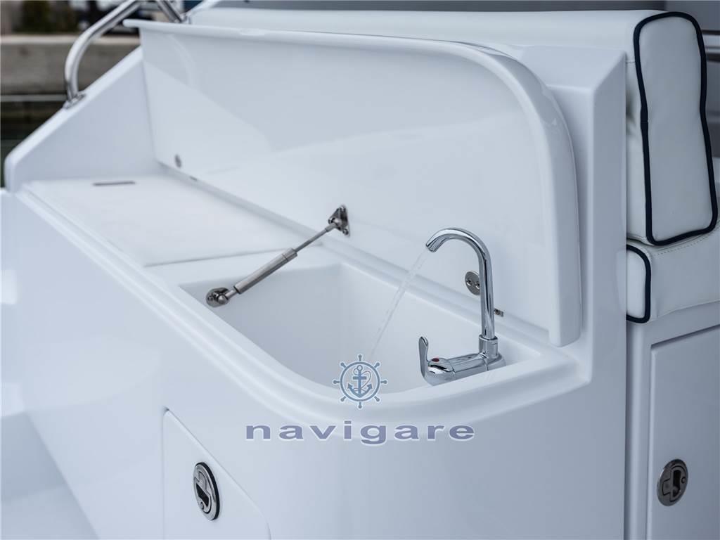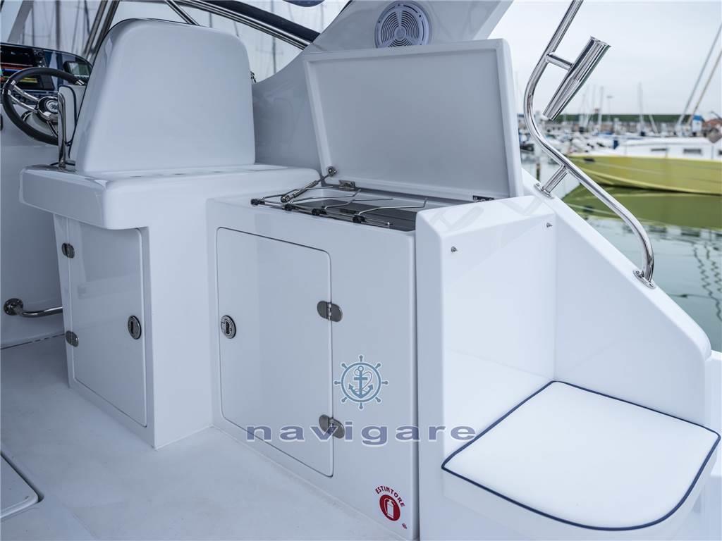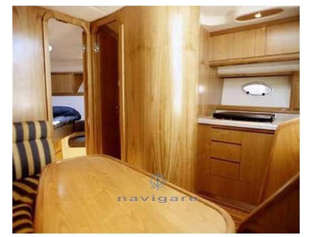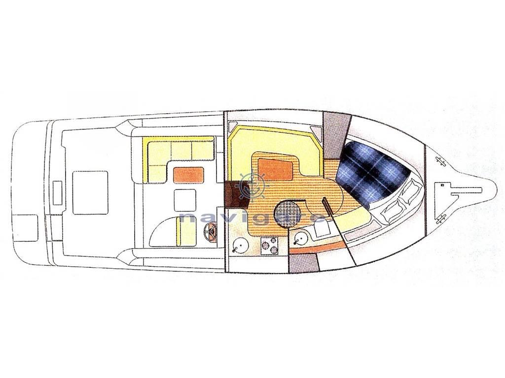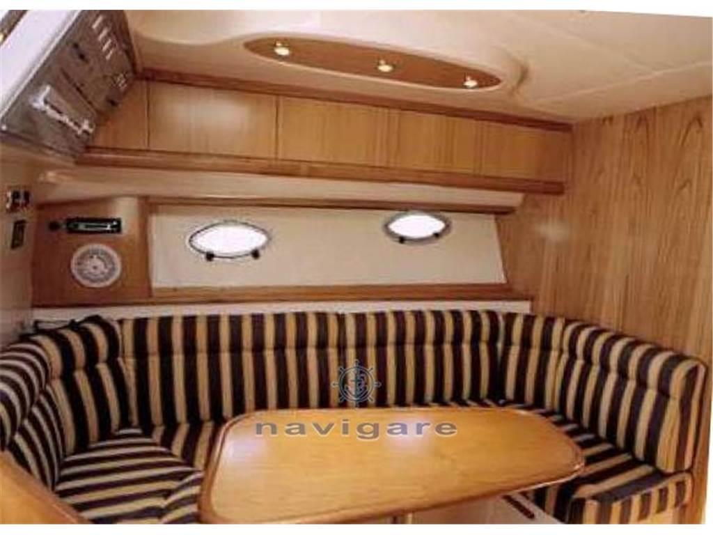 La linea pulita e slanciata, buona abitabilità e prestazioni, è caratterizzato da ampi spazi esterni organizzati e funzionali. All'interno una cabina di prua ampia, ben disposta e luminosa, con rivestimenti in chiaro legno di rovere o a scelta del cliente.