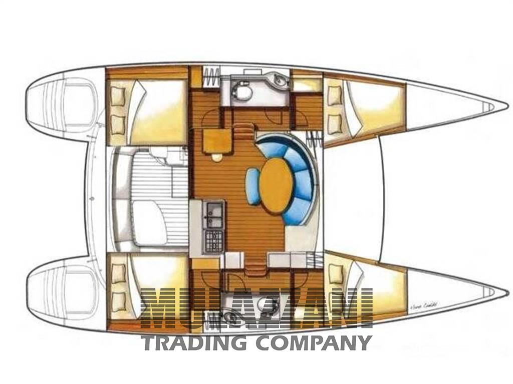 2 Matrimoniale italiana, 2 Cabina equipaggio, 1 Cucina, 1 Salone, 2 Toilette Equipaggio, 2 Toilette doccia no bidet, 2 Matrimoniale a V di prua