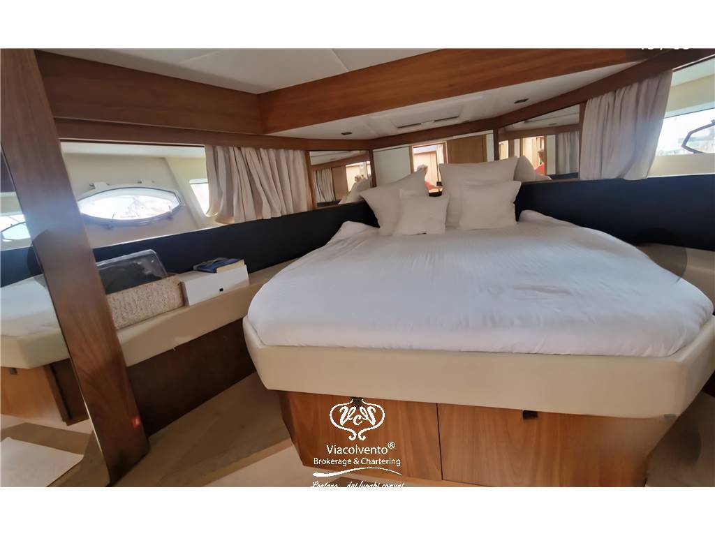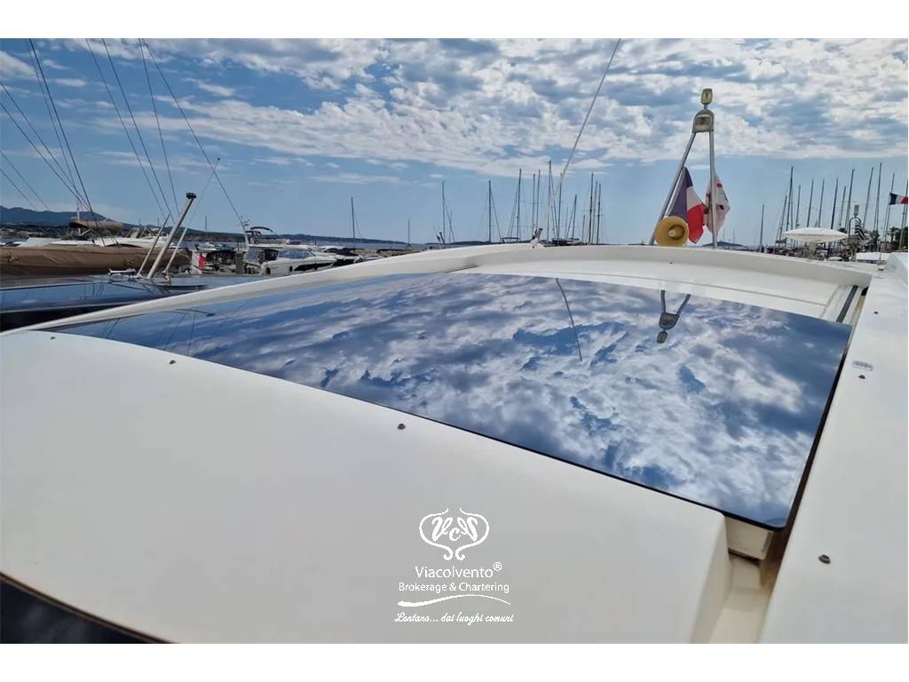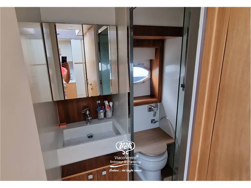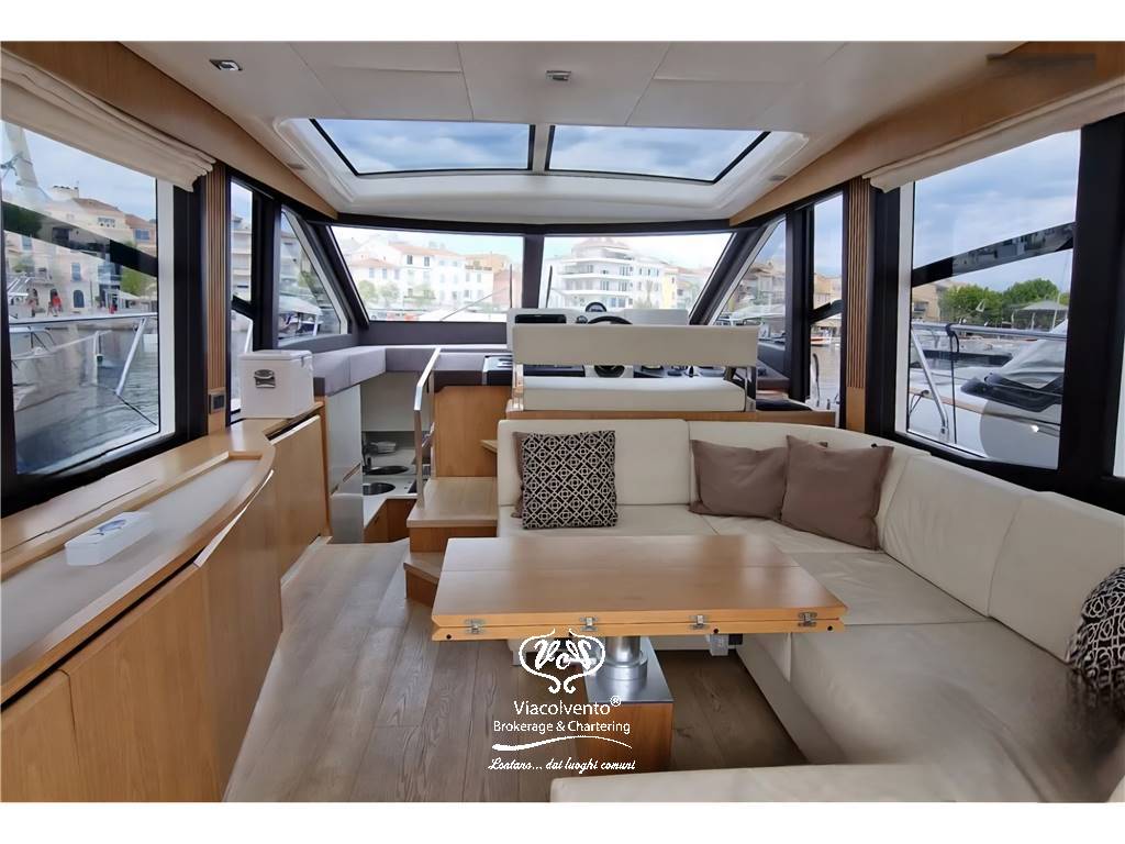 Il salone, dotato di numerosi ripostigli, di un divano modulabile e di una TV a scomparsa, è particolarmente luminoso grazie alla grande superficie vetrata della barca e al suo tetto apribile elettricamente.