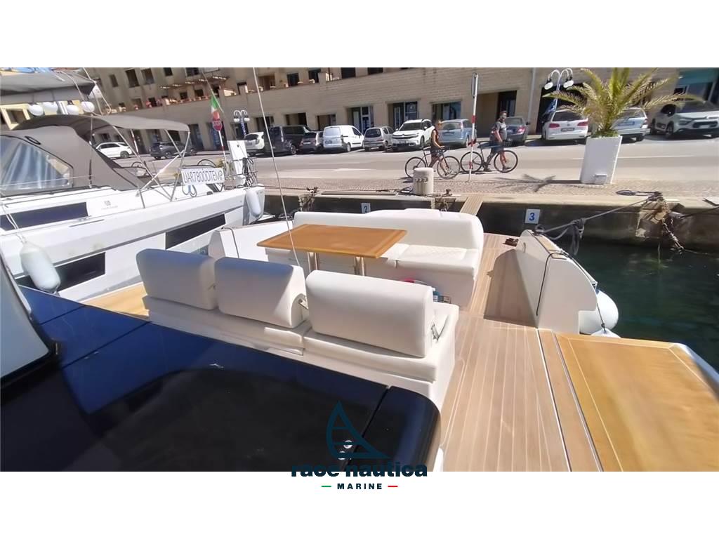 2 VOLVO PENTA IPS 650 (D6-480HP) oversized, natural teak with gray joints throughout the boat, light interiors, double cabin with double beds + dividing door between the two cabins, generator, double GARMIN 12" monitor, terrace that can be opened laterally, Automatic Interceptor, Manual Interceptor, Joystick Drive, Low Speed mode, Depth sounder, GRID remote control keyboard for multifunction display, Autopilot, Teak deck with black comment, supplement for gray comment, opening side terraces with teak covering, long stern platform with hydraulic up and down system including automatic descent ladder, stern sundeck with separate bench, electric opening, cushions, upgrade for diamond design on external upholstery, flag pole for two flags, hot/cold air conditioning in the bow area, complete aft master cabin of hull glazing, Separation wall with door for the two cabins, Digital chain counter, luxury kit, mooring kit, Stainless steel rod for bow peak fenders, Zstereo system in master cabin, Additional service batteries, Courtesy lighting package, 3 seat covers guide, stern sunbathing and sofa covers, stern seating covers, cockpit table cover, 5kW generator, stern Bimini with removable carbon poles complete with stowage supports.