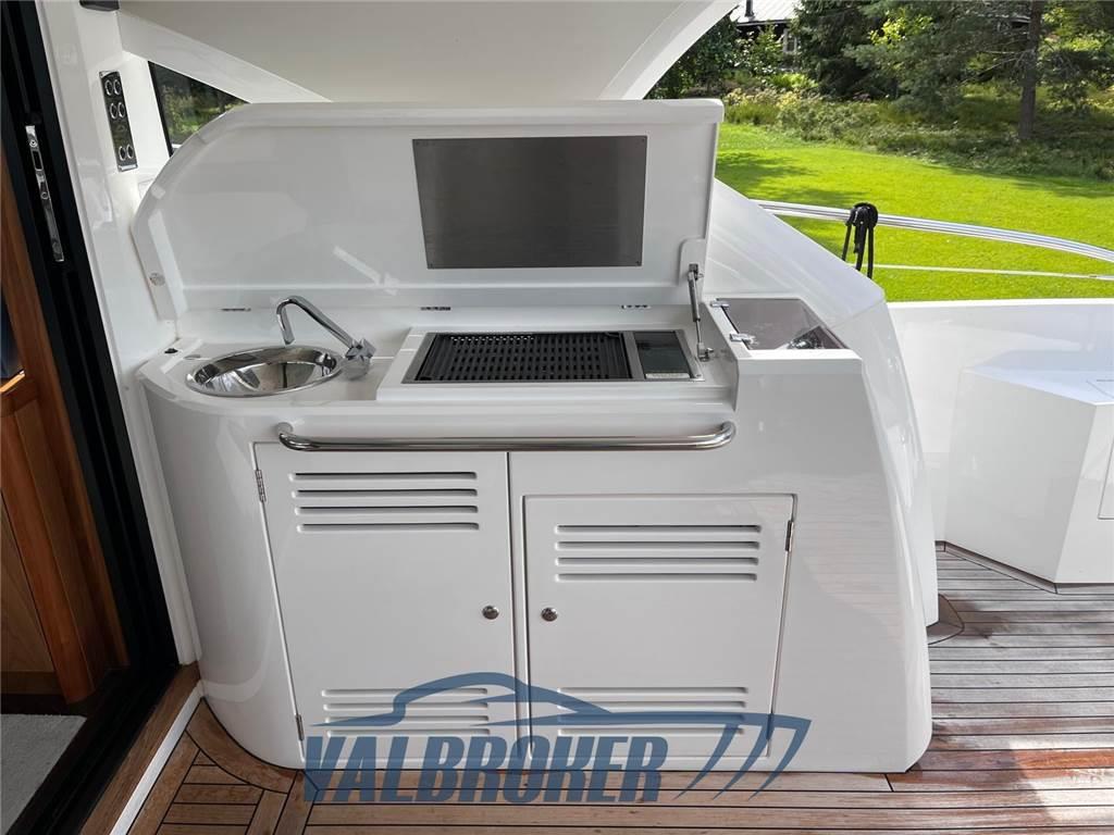 Prestazioni, eleganza e comfort. Prestazioni eccezionali in mare con i Volvo D13-900 con poche ore di moto. Porta scorrevole in vetro tra pozzetto e salone. Full optional: elica di prua e poppa, generatore, aria condizionata e riscaldamento, piattaforma tender-lift, garage per tender.