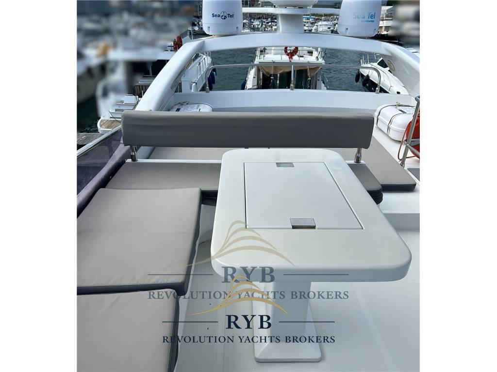 Allarme motore, Allarme sentina, Ancora, Doccia esterna, Doppia timoneria, Elica di poppa - stern thruster, Elica di prua - bow thruster, Flap idraulici, Impianto antincendio, Passerella, Piattaforma, Pompa di sentina automatica, Pompa di sentina elettrica, Porta ingresso, Pozzetto Teak, Presa 220V banchina, Rollbar, Salpa Ancore Elettrico, Selle per Tender, Tavolo pozzetto, Tender, Winch tonneggio di poppa.