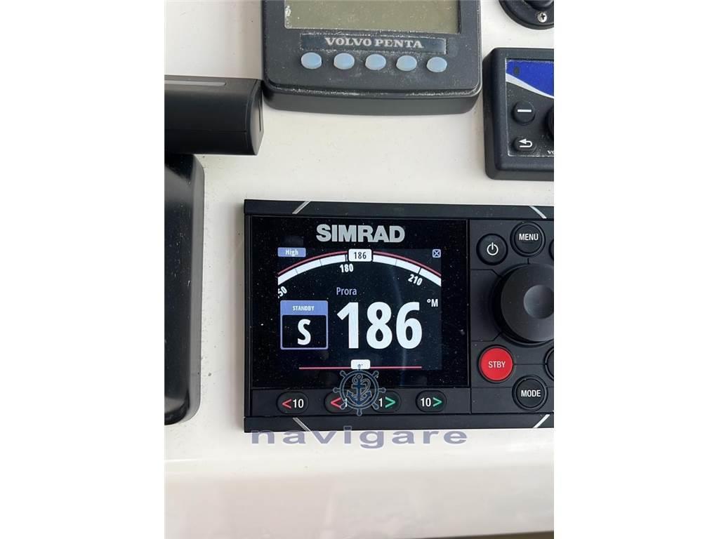 Allarme motore, Ancora, Autoclave, Batterie, Caricabatterie, Contamiglia, Doccia esterna, Ecoscandaglio (simrad nss evo3s 12"), Elica di prua - bow thruster, Flap elettrici, GPS (simrad nss evo3s 12), Hard top, Luci di cortesia, Passerella, Pilota automatico (simrad ap48), Pompa di sentina automatica, Pompa di sentina elettrica, Presa 220V banchina, Presa acqua banchina, Radar (halo 24), Radio VHF (simrad rs100), Salpa Ancore Elettrico, Scaletta da bagno