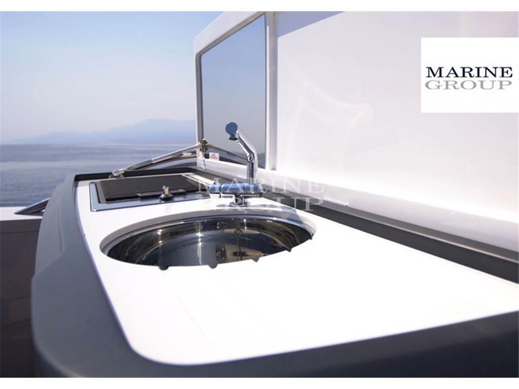 Passerella elettro idraulica 3,5m - Plancetta elettro idraulica affondante - Garage per il tender - Uscita 12v e rubinetto nel garage - Allestimento cabina marinaio - TV Sat con Dommy Dome - N.3 doccette con mixer (caldo-freddo) vicino ad ogni WC - Zanzariere in tutti gli oblò apribili - Aria condizionata caldo/freddo 90,000 BTU (più cabina equipaggio 6000 BTU) - Bimini Top in Grey Sunbrella canvas con luci regolabili - Ancora ULTRA MARINE - Tendalino nel cockpit elettrico - BBQ in pietra lavica al posto dello standard - Cassaforte nella cabina Armatore - Porta asciugamano riscaldato nei bagni armatoriale e ospiti - Aggiunta di 20 mt di catena per ancora (totale 80 mt) - Prese continentali 220/240 v - n.2 winches elettrici - Tetto scorrevole elettrico sopra il salone - Sedili consolle interna regolabili - Passaggio cavi TV nelle cabina a prua e a dritta - Generatore ONAN 19 kw - Stendardo sul pulpito - N.2 telecamere in sala macchine e a poppa per vedere la piattaforma bagno - Valvola tipo Gardena style per l'attacco diretto acqua dolce a poppa con limitatore di pressione - Sistema Audio PREMIUM - Cuscineria completa pozzetto, Sportfly e prua in Comfort Met MACADAMIA - Coperture esterne Sportbridge e pozzetto in Grey Sunbrella Supreme - Tavolo da caffè a prua - Lavatrice ed asciugatrice separate - Ice maker