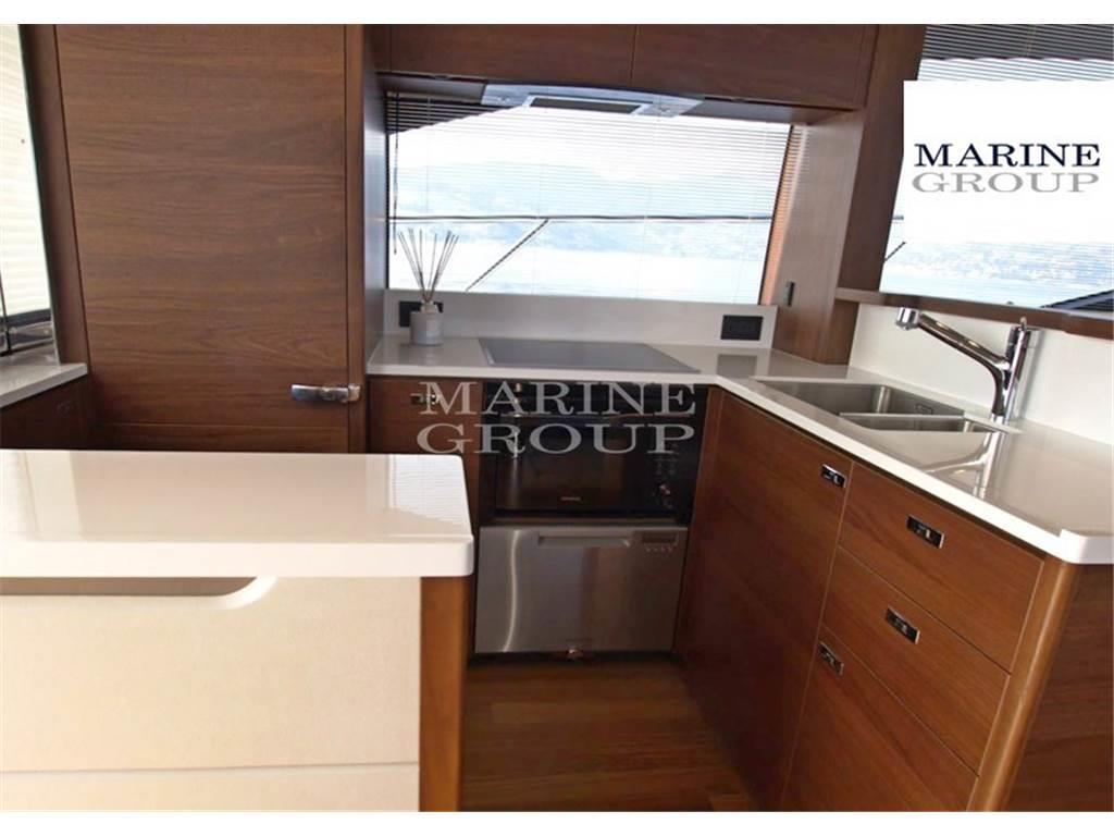 Cucina super equipaggiata con lavastoviglie Fisher Paykal, rubinetto con doccetta e upgrade fuochi Miele - Top cucina in Porcelain White Solid surface - Area pranzo con upgrade cuscineria dinette in pelle Quartz - N.2 sgabelli interni - Pavimento in noce all'ingresso e in cucina e upgrade pavimento in noce anche nel salone e nella timoneria - Sedute timoneria interna in pelle Sapang Bronze - Upgrade cuscineria salone in pelle Quartz - Top tavolo caffè nel salone in Porcelain White - Cabina armatoriale a centro barca con area guardaroba e grande bagno - Upgrade cuscineria divano cabina armatoriale in pelle Quartz - Upgrade per tutti i bordi dei letti in pelle White Line Brava - Upgrade testate letto in pelle Ice White - Cabina Vip a prua con bagno ensuite - Cabina ospiti di dritta con letti converitibili in matrimoniale e accesso diretto al terzo bagno - Cabina di sinistra con armadio al posto del secondo letto - Cabina equipaggio a poppa