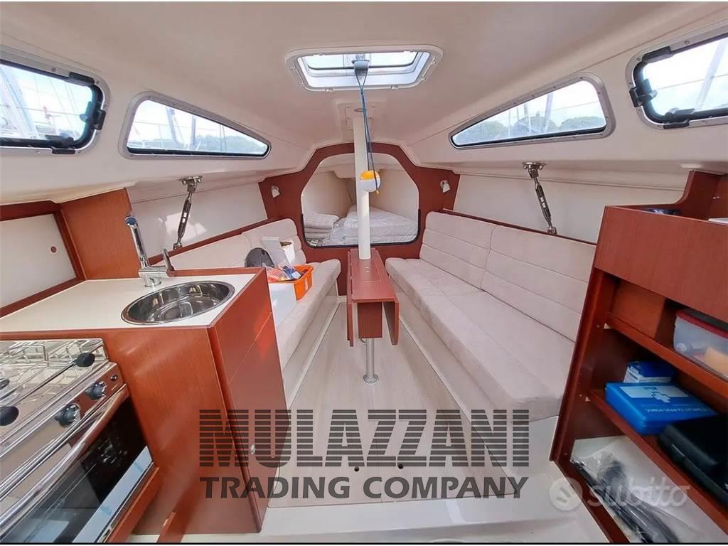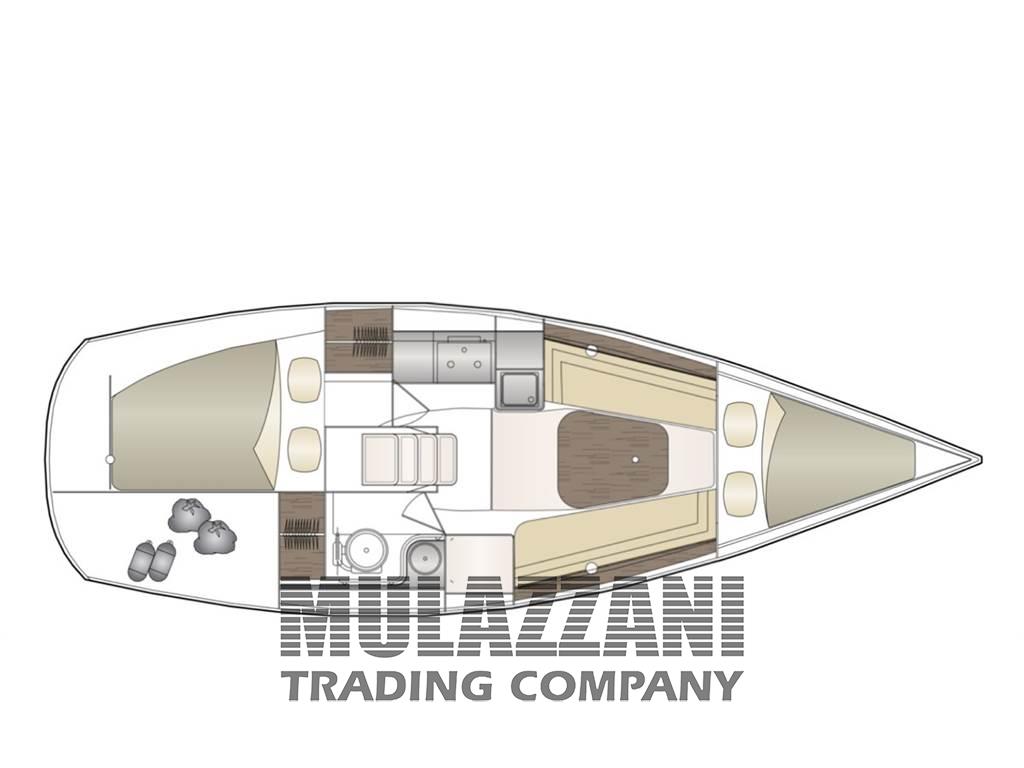 Il pozzetto è contenuto con il carrello del trasto della randa che lo divide a metà, lo specchio di poppa è apribile. All’interno ci sono una cabina a poppa, il quadrato con seduta centrale a “ferro di cavallo” divisa dalla cabina di prua da una tenda, un bagno e la cucina.