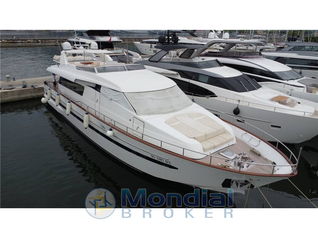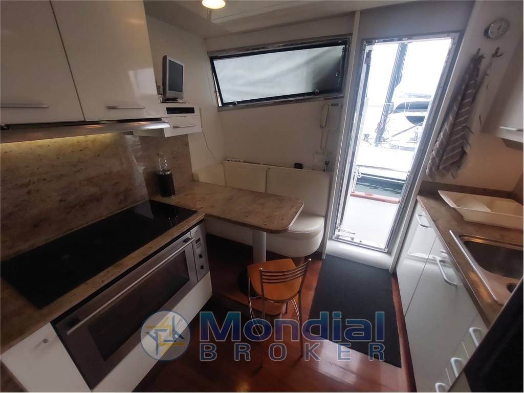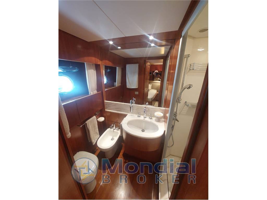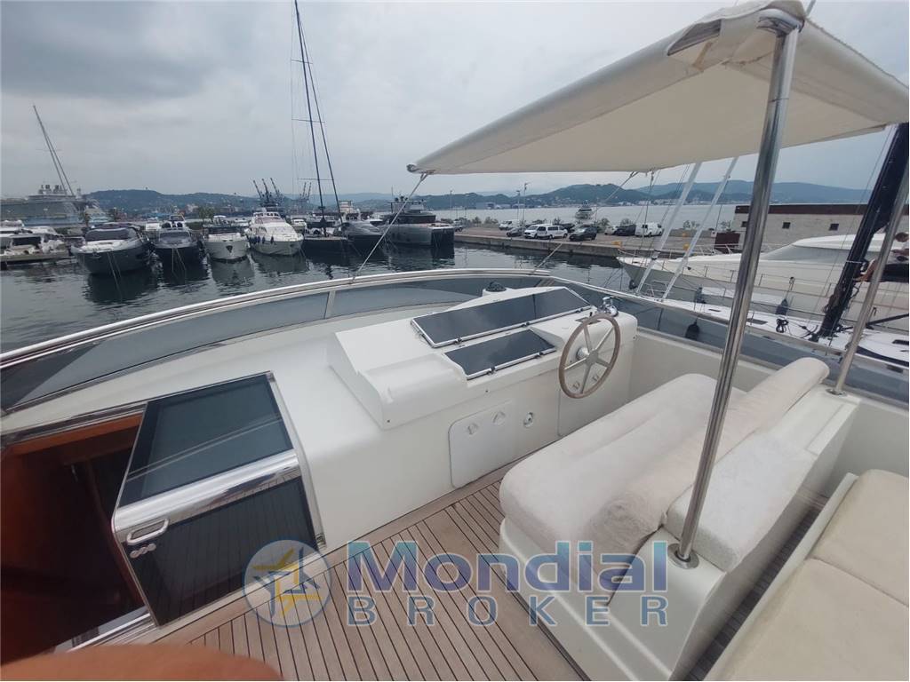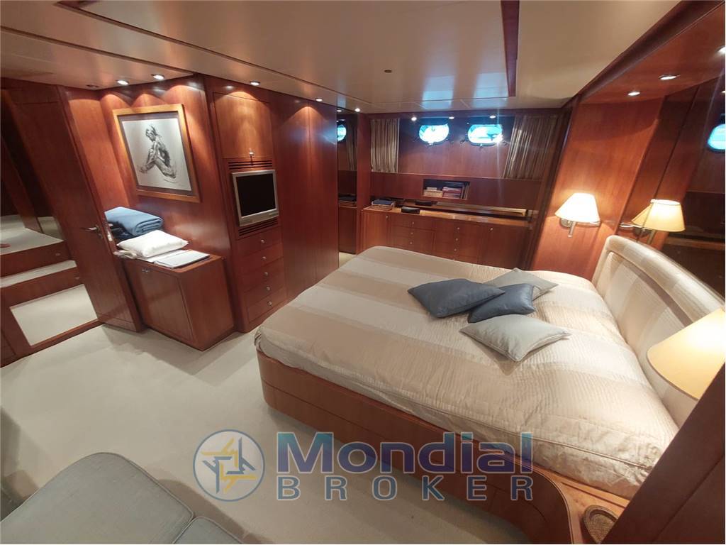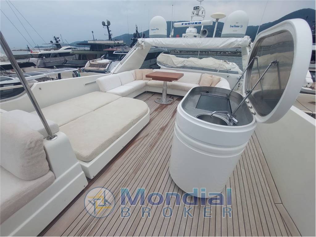 Passerella idraulica retrattile a scomparsa a poppa, spiaggetta di poppa in acciaio inox e teak con scaletta bagno integrata, tientibene con cancelletti di ingresso laterali, porta di accesso alla cucina dal camminamento di dritta, camminamenti laterali ampi e protetti, porta d’ingresso principale al salone con vetro scorrevole, verricelli salpa ancora elettrici nuovi con motori 220V e coperture inox, 2 ancore da 55 kg con catene da 12 mm x 100 m, bocche d’ancora, rulli, bitte e passacavi in acciaio inox, gruetta idraulica sul flybridge per movimentazione tender e motorino, tender idrogetto posizionato sul fly, sella dedicata per motorino sul flybridge, tavoli e sedute in teak su flybridge e pozzetto, grill giapponese integrato sul fly, zona prendisole a prua e sul fly, impianto elettrico 24V / 220V con quadro centralizzato in sala macchine, doppio generatore Kohler 11 kW con quadro di controllo, inverter Mastervolt 2500W, caricabatterie Mastervolt 80A, dissalatore Idromar MC3 (130 lt/h, nuovo), impianto aria condizionata con fan coil indipendenti in ogni locale, impianto WC elettrico con maceratore, impianti acque nere, grigie e chiare con serbatoi dedicati e scarico in banchina, pompe elettriche e manuali per aspirazione, mandata, ricircolo e travaso gasolio, autoclave con pressostato e protezione doppia (automatica e diretta), serbatoio acqua dolce da 1.800 lt ca., serbatoi carburante in acciaio da 7.000 lt totali con livello visivo ed elettronico, impianto antincendio SEMCO con bombola CO₂ da 30 kg in sala macchine, estintori portatili in tutti gli ambienti, pompa antincendio con aspirazione da mare e sentina, mandata su ponte e sala macchine, impianto rilevazione fumi, gas e liquidi in tutti i compartimenti tecnici, lavastoviglie, forno elettrico, cucina a induzione, 3 frigoriferi totali distribuiti tra cucina e zone living, illuminazione interna ed esterna completa, sistema telefonico interno con predisposizione GMDSS.