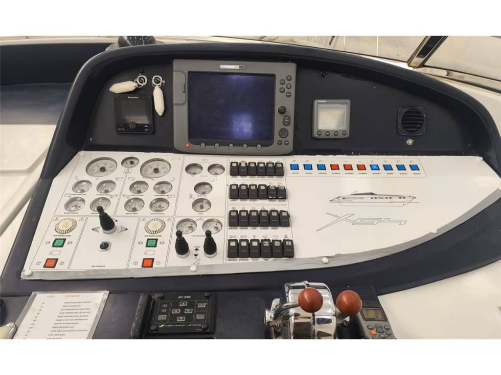 Angolo barra, Antenna radar, Bussola, GPS Raymarine E120, Raymarine tridata, Radar, Radio VHF, Pilota automatico, Elica di prua, Flaps, comando salpa ancora elettrico, faro orientabile, Tromba, indicatori analogici: carburante, acqua, giri motori,