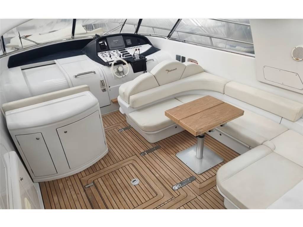 Lo spazio è organizzato idealmente in tre ambienti: un grande prendisole a poppa (una sezione del quale è sollevabile per accedere nella cabina degli ospiti) la zona living con divano a U, tavolino in mezzo e mobile frigo di fronte e la timoneria a prua. Disposizione interna
