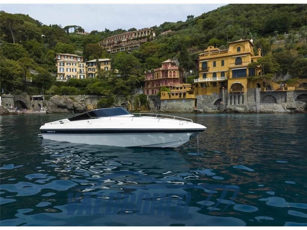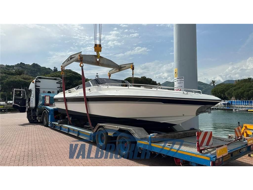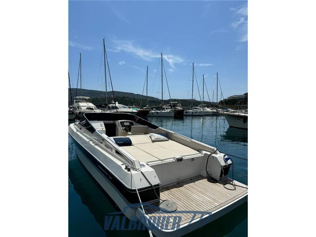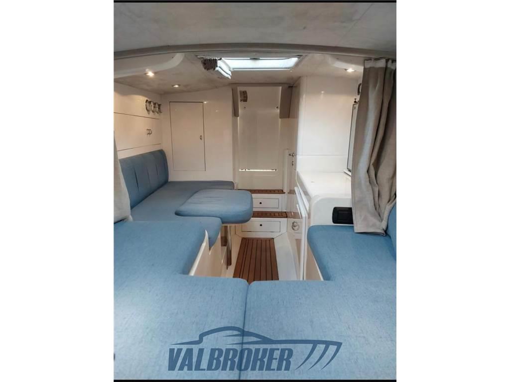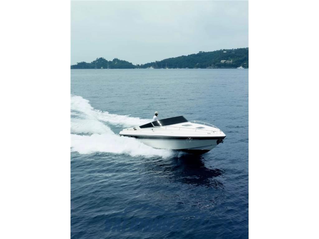 Ampio prendisole fisso a poppa. Letto matrimoniale a V di prua, bagno con porta, cucina e dinette trasformabile in letto singolo.Barca sportiva ed elegante.