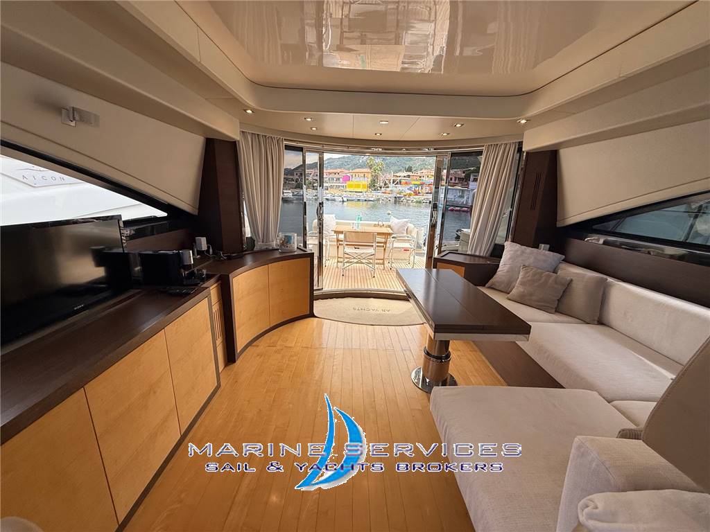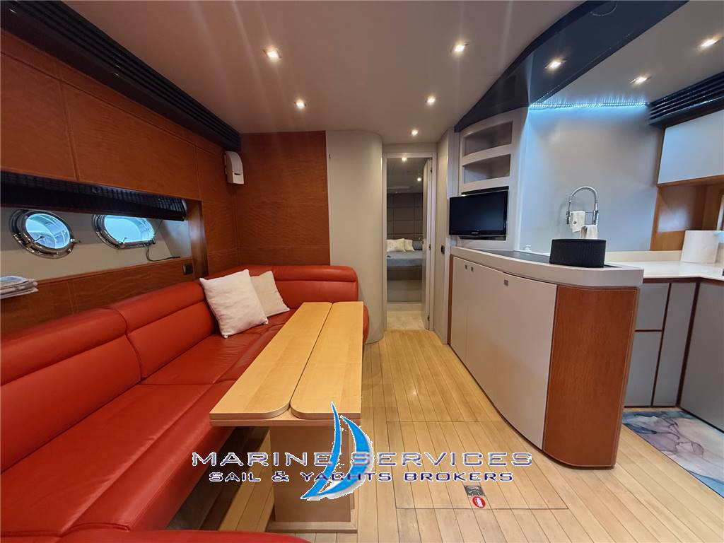 pavimenti tutto in venge' color noce e divanerie in pelle color scarlatto - Al ponte superiore luminoso Salone Open Space con grande divano ad L a murata sx e grande penisola amovibile + tavolo basso , contrapposto comodo mobile basso con comodi contenitori e altro divano con 2 sedute ad angolo a dx - dietro alle timoneria troviamo un mobile con il TV al plasma da 42' a scomparsa , piu avanti a sx altro mobile con icemaker e chaiselounge - Timoneria con seduta pilota e copilota in pelle color Bianco - Scala di discesa al ponte inferiore che porta alla zona notte e alla Grande e completa cucina separata con porta e completa con pensili e con piano di lavoro in marmo nero, 4 fuochi in vetroceramica, lavello ,grande frigo , forno microonde, lavastoviglie doppio lavello inox , e pensili vano con dispensa - verso poppa troviamo due scalini per accedere alla grande e spaziosa Suite armatoriale a centro barca con letto matrimoniale rivestito in legno, mobile con scrittoio e con Tv Lcd 42' a parete con impianto Sat ,cd-dvd e telefono ,comoda cabina spogliatoio con armadio , elegante e spazioso bagno privato con sanitari color nero wc e bidet , ripiano in cristallo e con 2 lavabi color nero e box doccia con porta in cristallo separato + mobile con ripiani e speccchiera a parete- Cabina ospiti con 2 letti in piano ,Tv lcd 24' a parete con impianto Sat ,cd-dvd e telefono e con bagno privato con wc, lavabo, ripiani e box doccia cristallo e specchiera a parete - A pua la cabina Vip con letto matrimoniale a isola , cassettiere , armadio ,Tv lcd 24' a parete con impianto Sat ,cd-dvd e telefono e bagno privato con wc , bidet, 2 lavabi color nero + ripiani e speccchiera a parete +