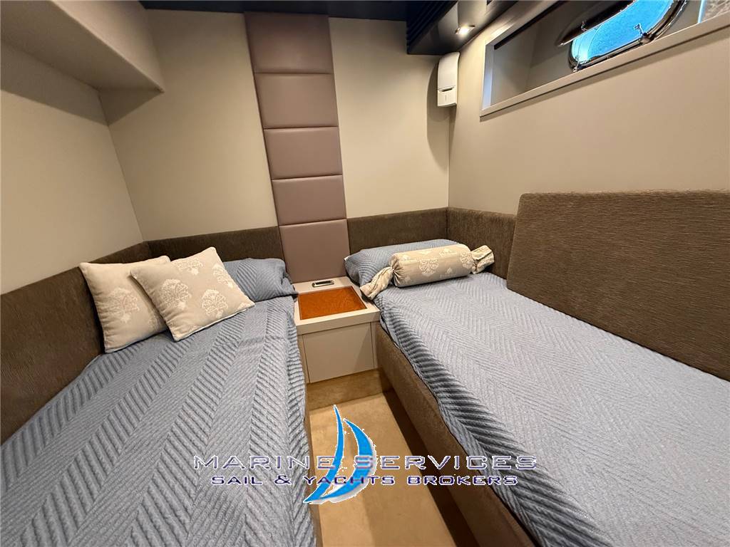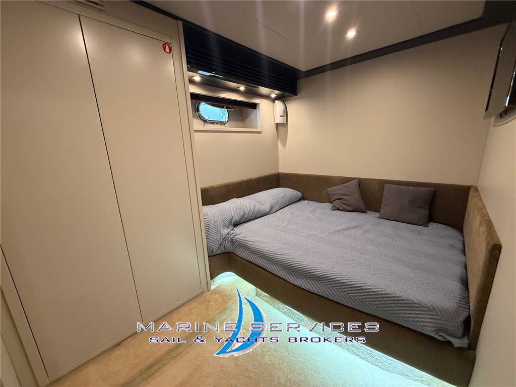 Essential modern interiors very well kept with wood floors and in perfect condition - all furniture and floors and furniture in is' walnut-colored nubuck leather sofas and Binaca perfect - the upper deck, bright open plan lounge with a large L shaped sofa and left at side + great peninsula removable coffee table, comfortable furniture contrasted below with boxes and more comfortable sofa with 2 chairs at an angle to the right - behind the wheelhouse there is a cabinet with the plasma TV from 42 'to death, ahead of most other furniture left with icemaker and cheiselounge - Wheelhouse with pilot and copilot in white leather - Scale down to the lower bridge that leads to the sleeping area and full kitchen and large U-shaped orange-colored Salvarani separate door and complete with wall units with marble worktop Black, 4 burner stove, sink, large fridge, 250 lt Americana,microwave, dishwasher stainless steel double sink, and cabinets with pantry compartment - aft there are two steps to access the large and spacious suites with queen amidships double coated wood furniture with a desk and LCD TV 42 'wall system with satellite, dvd and cd-phone, comfortable cabin dressing room with wardrobe, elegant and spacious private bathroom with sanitary black toilet and bidet, and glass shelf 2 black sinks and shower with glass door cabinet with shelves and a separate + speccchiera-walled guest cabin with 2 twin beds, LCD TV 24 'wall system with satellite, dvd and cd-telephone and private bathroom with toilet , sink, shelves and glass shower wall and speccchiera - A pua the VIP cabin with double bed in the island, drawers, wardrobe, LCD TV 24 'wall system with satellite, dvd and cd-telephone and private bathroom with toilet, bidet , 2 + Black sinks speccchiera wall shelves and another room with shower + separate glass shower - Spacious cockpit with teak floor furnished with