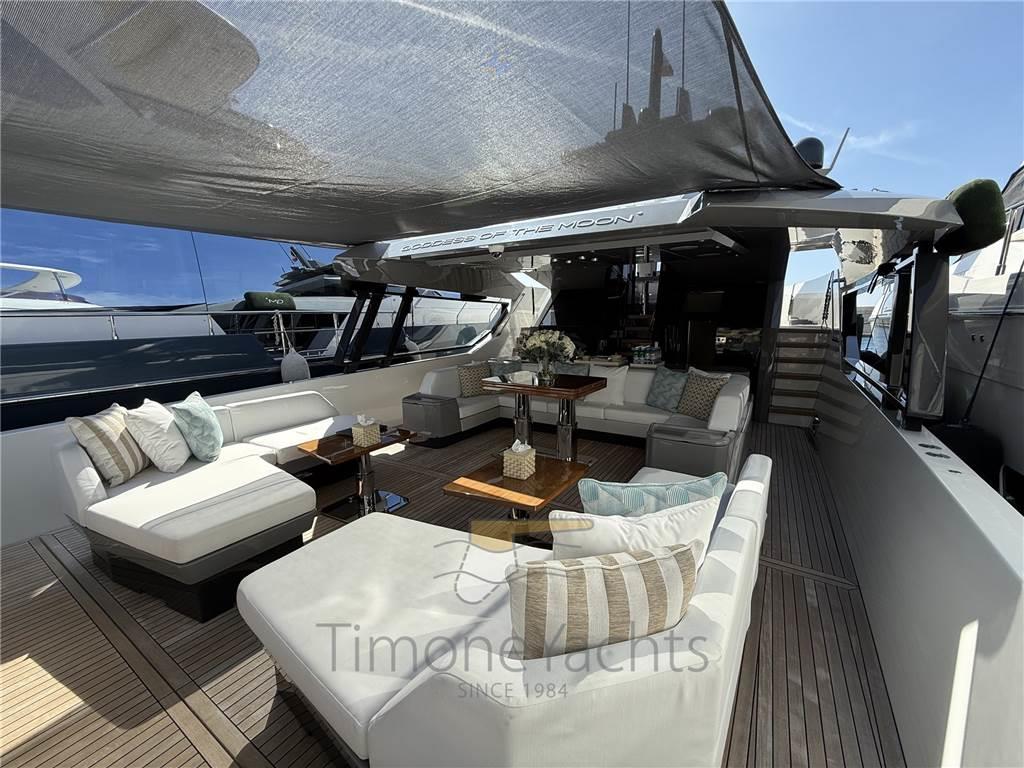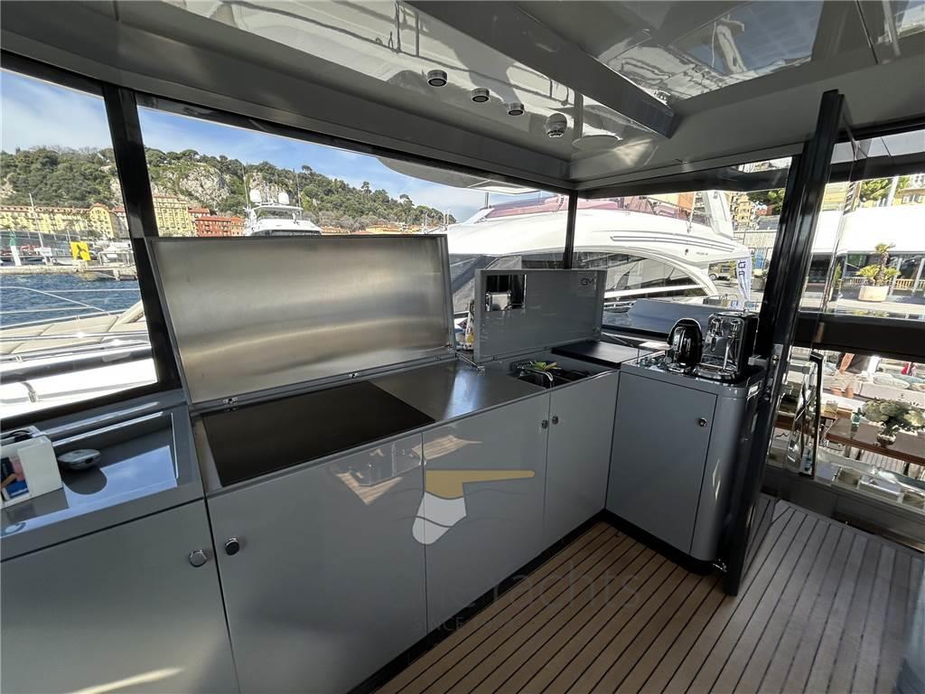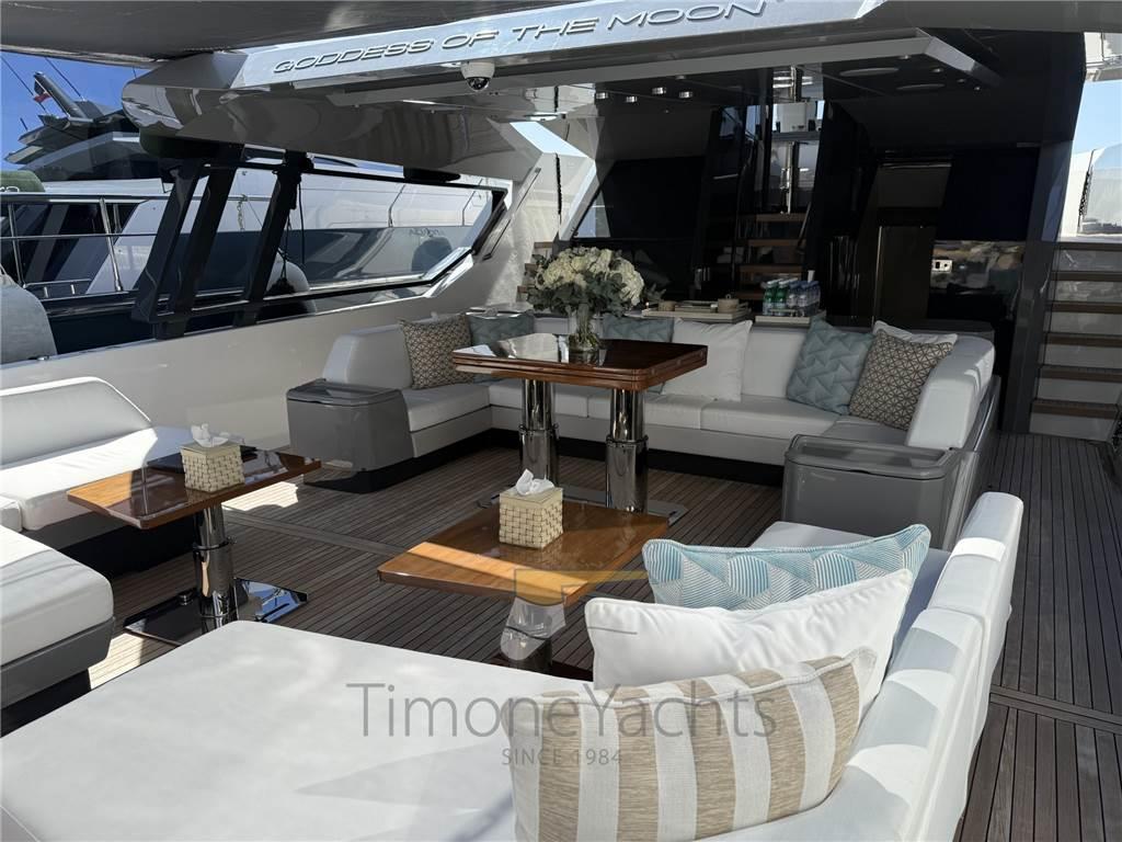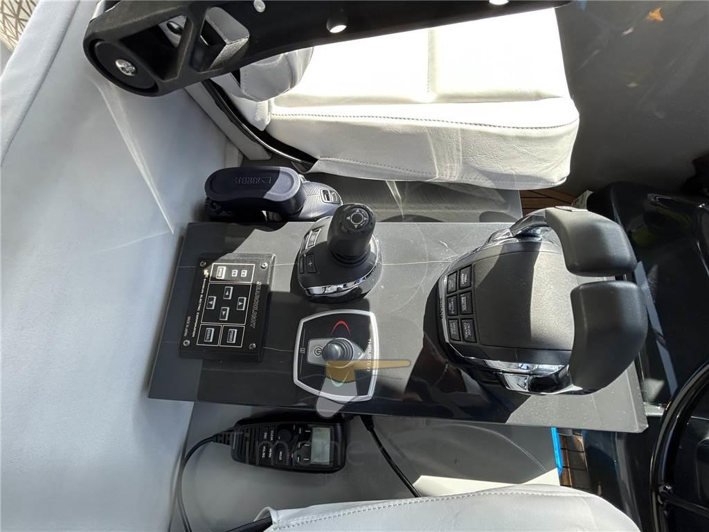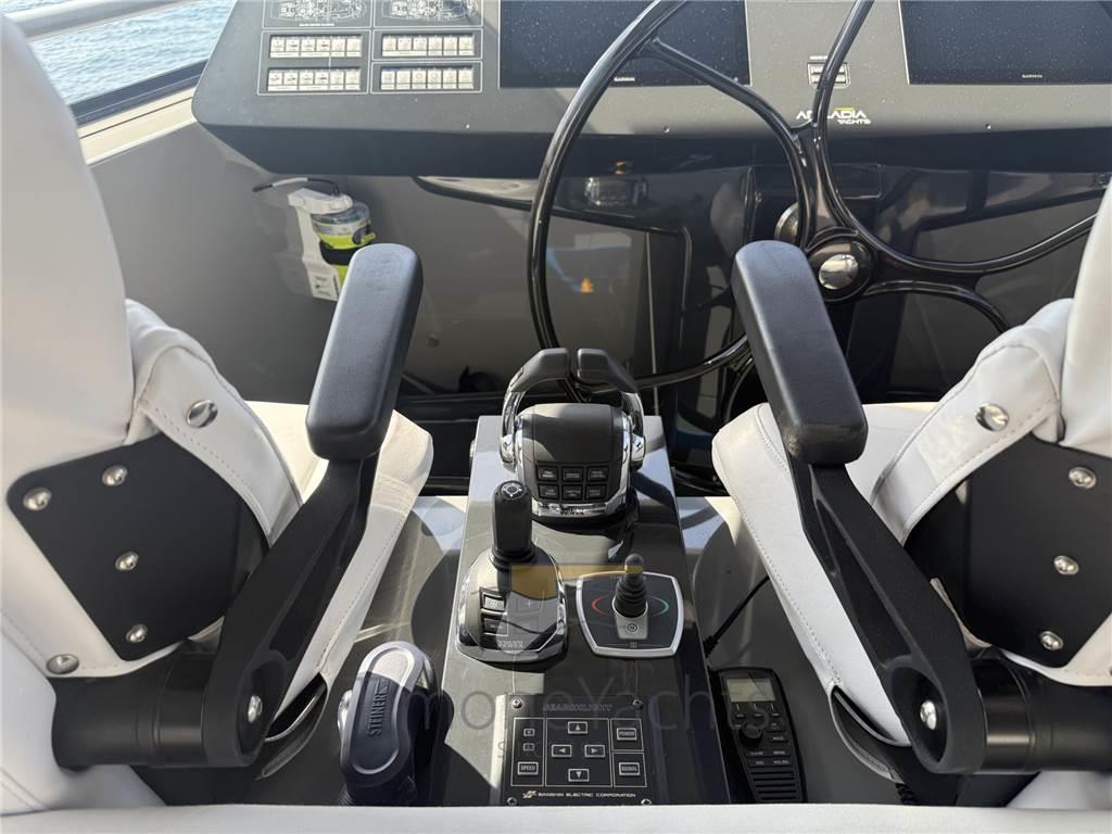AIS, Ancora, Angolo barra, Antenna radar, Autoclave, Batterie, Bussola, Camminamenti laterali in teak, Caricabatterie, Comando motori elettronico, Computer di bordo, Contametri catena, Contamiglia, Display, Doccia esterna, Doppia timoneria, DSC vhf, Ecoscandaglio, Elica di prua - bow thruster (Electric Vetus), Flap idraulici, Garage per tender, GPS, Gruette per moto d'acqua, Gruette per tender, Impianto antincendio, Indicatori Flaps, Joystick, Lavaggio catena, Lavandino nel Pozzetto, Luci di cortesia, Luci di navigazione, Moto d'acqua, Pannelli Solari (1.5 kW of electricity for the onboard appliances), Passerella, Piattaforma (400 KG Capacity), Pilota automatico, Plotter, Plotter con antenna GPS, Pompa di sentina automatica, Pompa di sentina elettrica, Ponte in teak, Porta ingresso, Pozzetto Teak, Presa 220V banchina, Presa acqua banchina, Radar, Radio VHF, Scaletta da bagno, Sedile Copilota, Stabilizzatori (Seakeeper Gyro Model 9), Tavolo pozzetto, Tender, Tromba