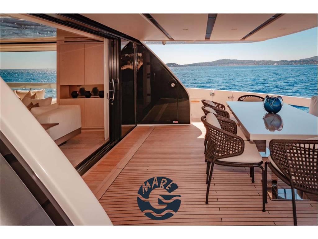 Gli esterni offrono spazi ampi e modulabili: tavoli elettrici up/down in pozzetto e in prua, divani custom, pavimentazione in teak sul flybridge con doccia inox integrata, TV da 49” hi-lo e zona pranzo con cucina esterna completamente attrezzata.