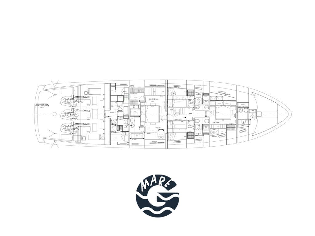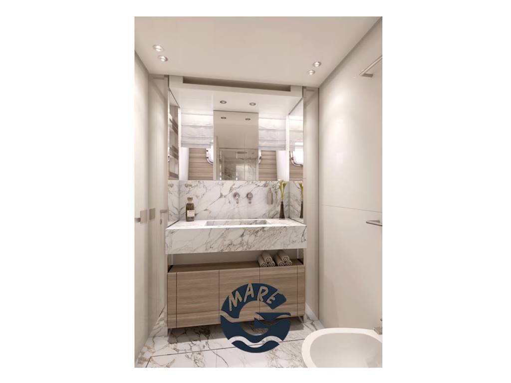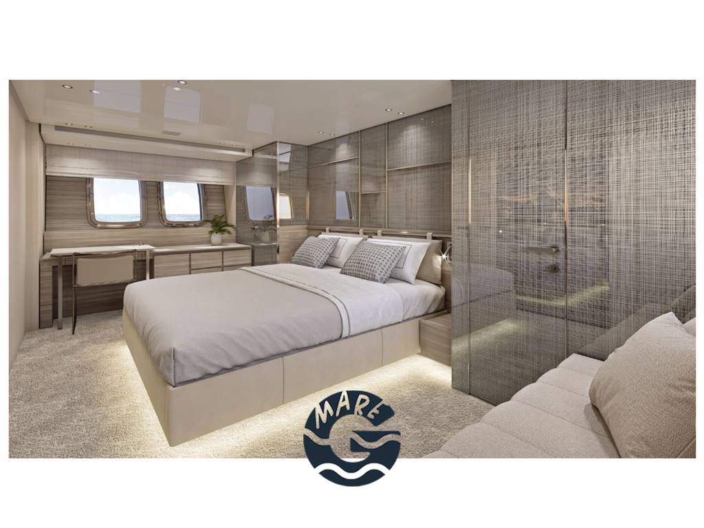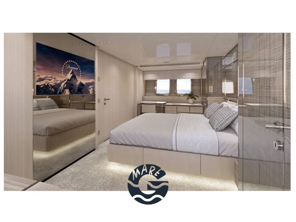 Cabina armatoriale a tutto baglio con letto sollevabile, TV dietro specchio Stopsol, bagno privato e cabina armadio; isolamento aggiuntivo tra area armatore ed equipaggio.