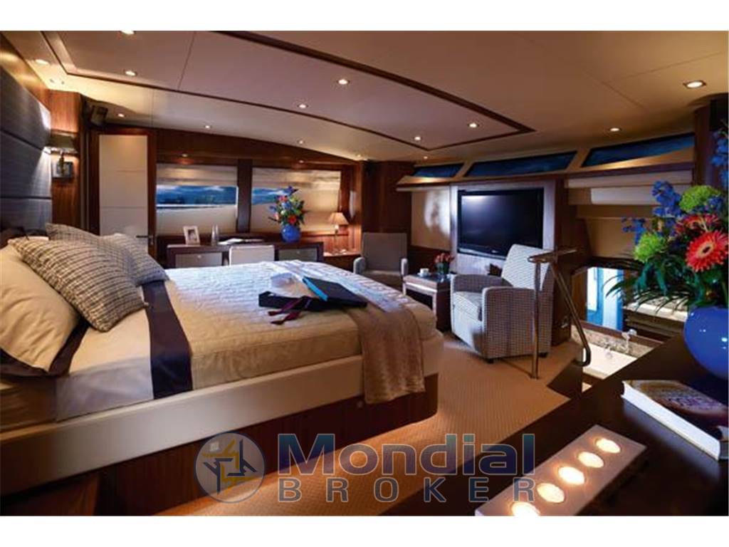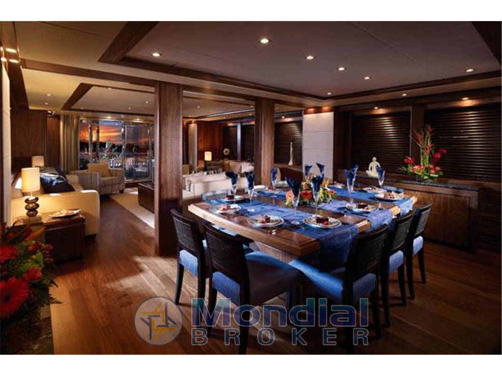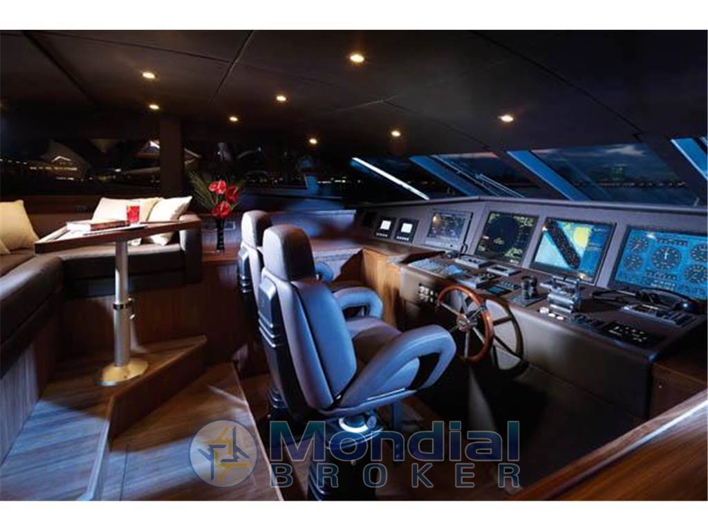 The flybridge is a key attraction and features exterior entertainment systems, an electronic sliding hard top and an aft Jacuzzi tub, all dedicated to al fresco entertainment for guests on board. Trac digital fin stabilisers, while twin MTU 2000 Series M94 engines give her a cruising speed of 18 knots.