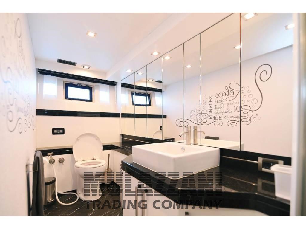 CABINA ARMATORIALE A CENTRO BARCA CON BAGNO ENSUITE, BOX DOCCIA SEPARATA . 2 CABINE OSPITI A LETTI IN PIANO CON ACCESSO A BAGNO CONDIVISO. CABINA VIP DI PRUA CON LETTO CENTRALE ED ACCESSO A BAGNO PRIVATO