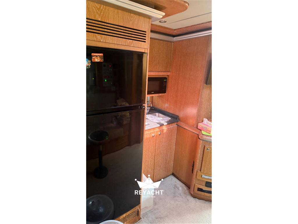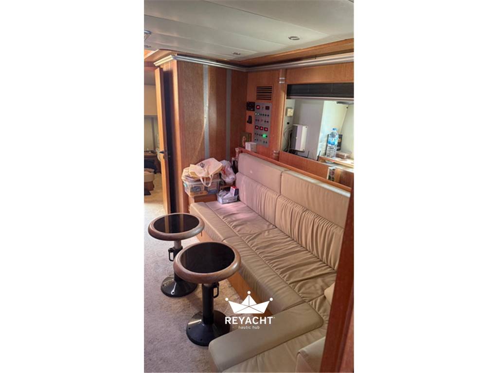 Les extérieurs sont un véritable triomphe de style contemporain. Le cockpit et les surfaces environnantes ont été habillés de fibre de carbone, conférant au yacht un caractère moderne et affirmé. Les selleries, entièrement refaites dans un mélange sur mesure de tissu Sumbra et de cuir, ajoutent une touche de luxe discret et raffiné. La passerelle hydraulique escamotable et le garage arrière à ouverture hydraulique complètent un ensemble esthétique et fonctionnel où rien n’a été laissé au hasard.