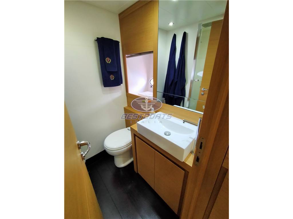 Ancora, Autoclave, Autogonfiabile, Camminamenti laterali in teak da riveder, Caricabatterie, Colorazione, Doccia esterna, Elica di poppa e Elica di prua, Faro orientabile, Flap idraulici, Garage per tender, Impianto antincendio, Indicatori Flaps, Lavaggio catena, Luci di cortesia, Luci subacquee, Passerella, Piattaforma, Porta ingresso, Pozzetto Teak, Presa 220V banchina, Presa acqua banchina, Salpa Ancore Elettrico, Scaletta da bagno, Tavolo pozzetto, Tromba, Winch Elettrico.