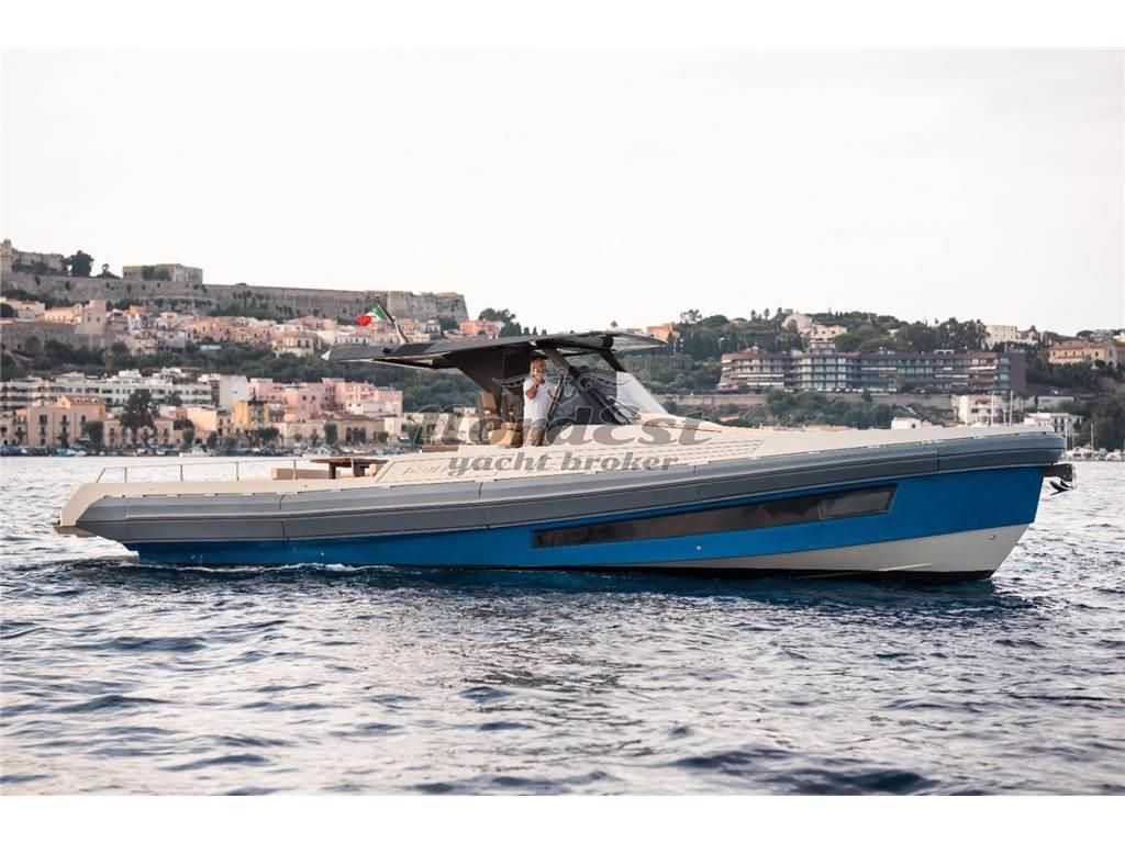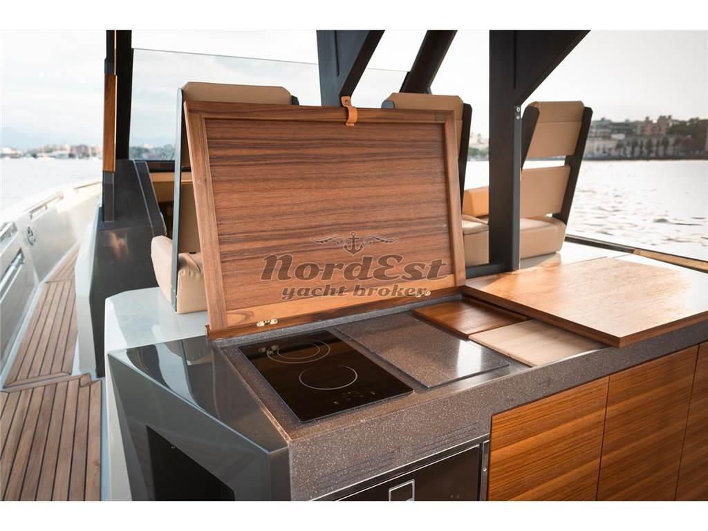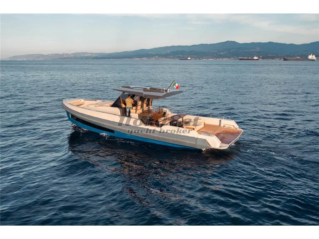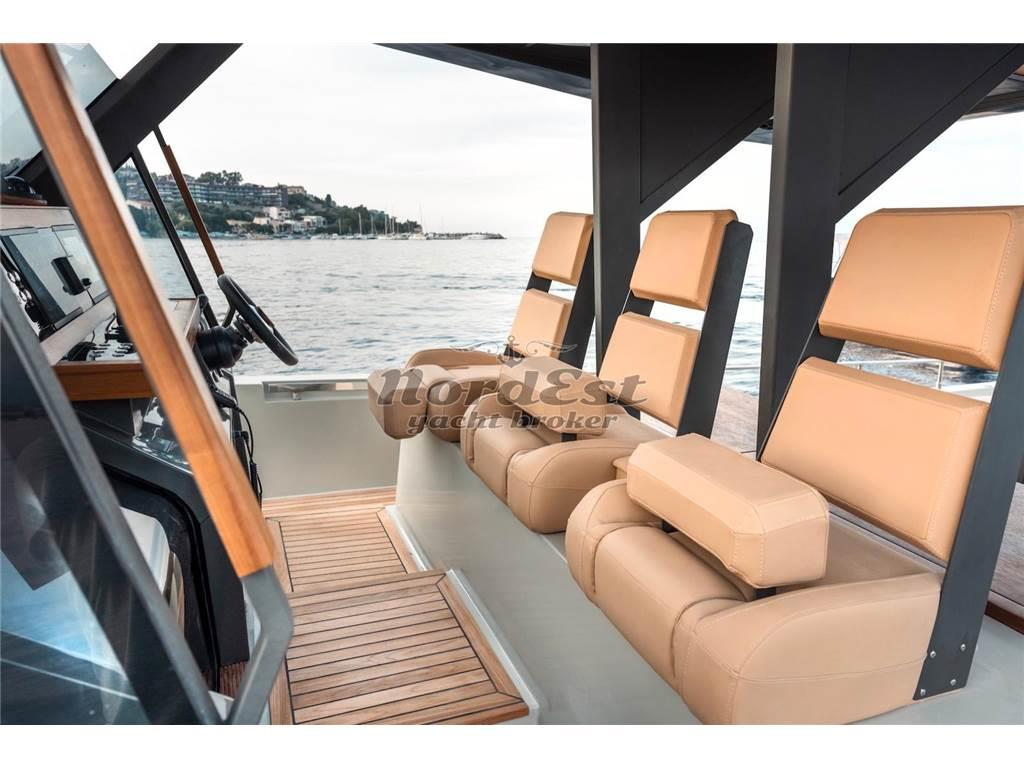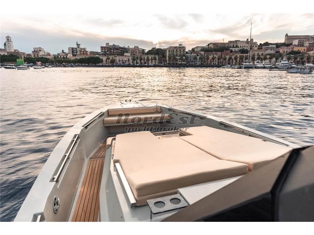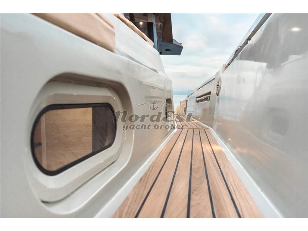 Eleganza, sportività ed essenzialità del design. Piattaforme mobili laterali pneumatiche di poppa. Tubolari laterali di protezione di nuova generazione. Hard-top di grandi dimensioni. Torrini di poppa multifunzione. Inoltre trasformabilità e possibilità di avere pluri-layout. Applicazione delle norme di EcoDesign per il disassemblaggio. Utilizzo di materiali innovativi, ecosostenibili e naturali. Applicazioni Smart Boat per il monitoraggio a distanza. GPR stratificato a mano ed in infusione, gel-coat isoftalico, stratificazione principale in resina isoftalica e per i primi strati di laminazione resina vinilestere, tessuti e rinforzi in vetroresina unidirezionale, opera morta in vetroresina e sandwich 20mm, componenti superiori in Kevlar, antivegetativa.