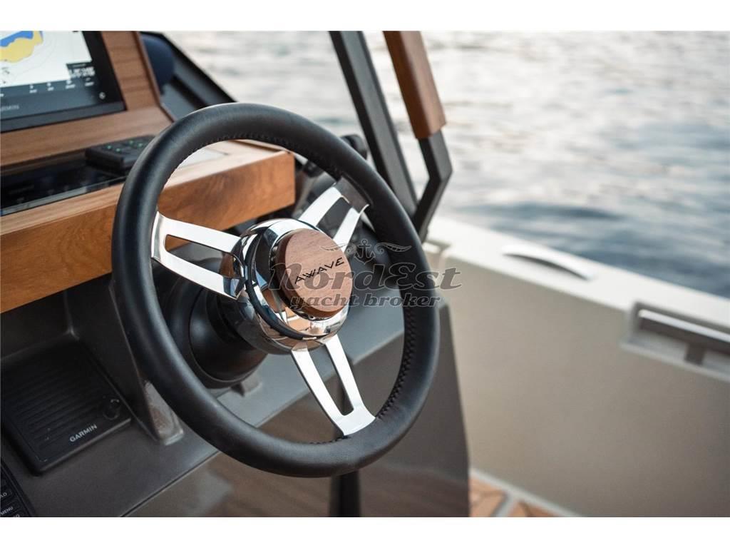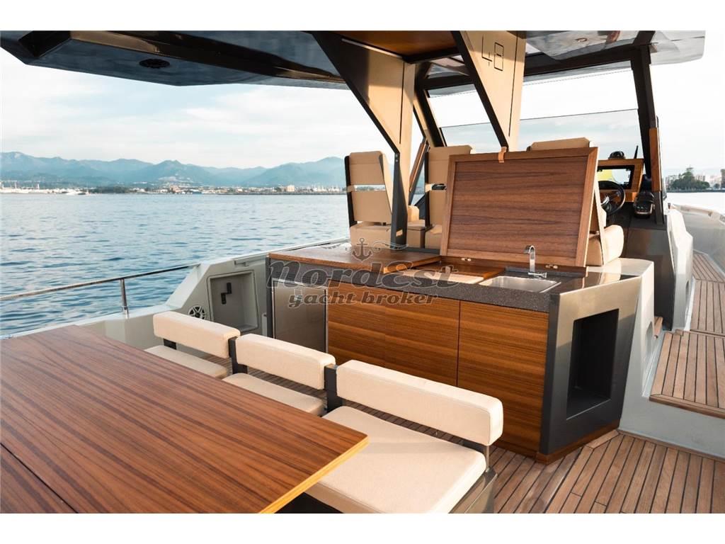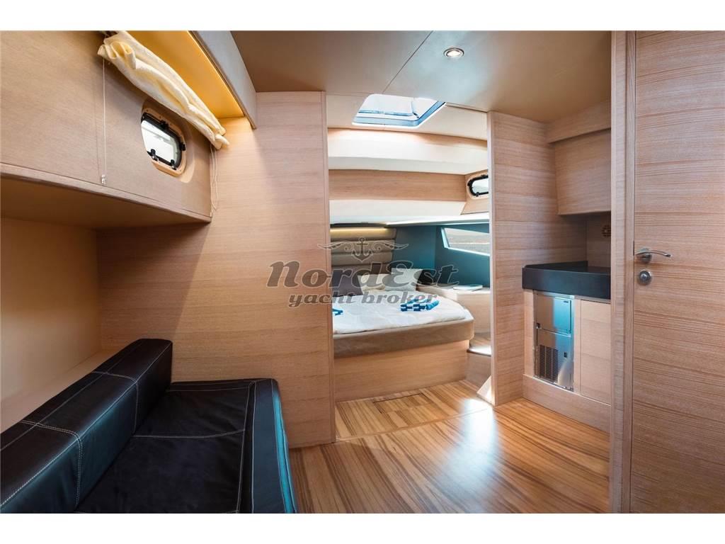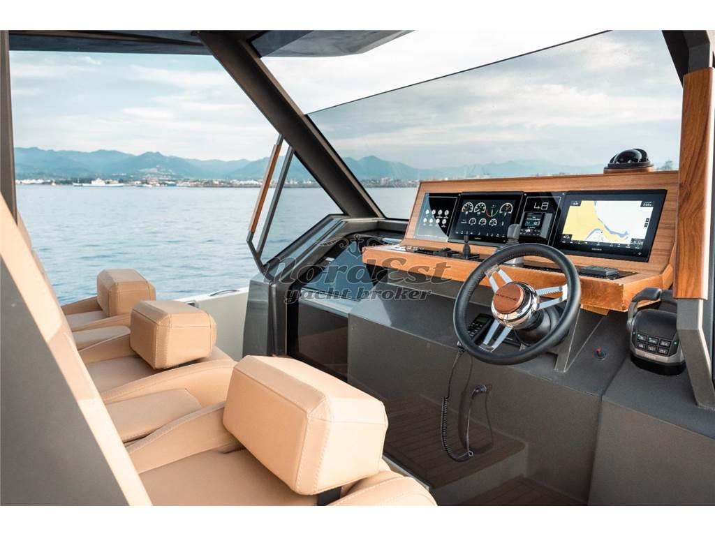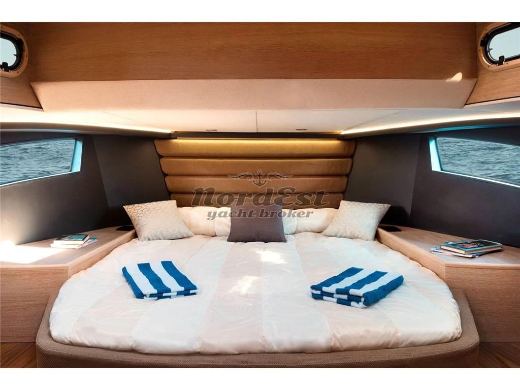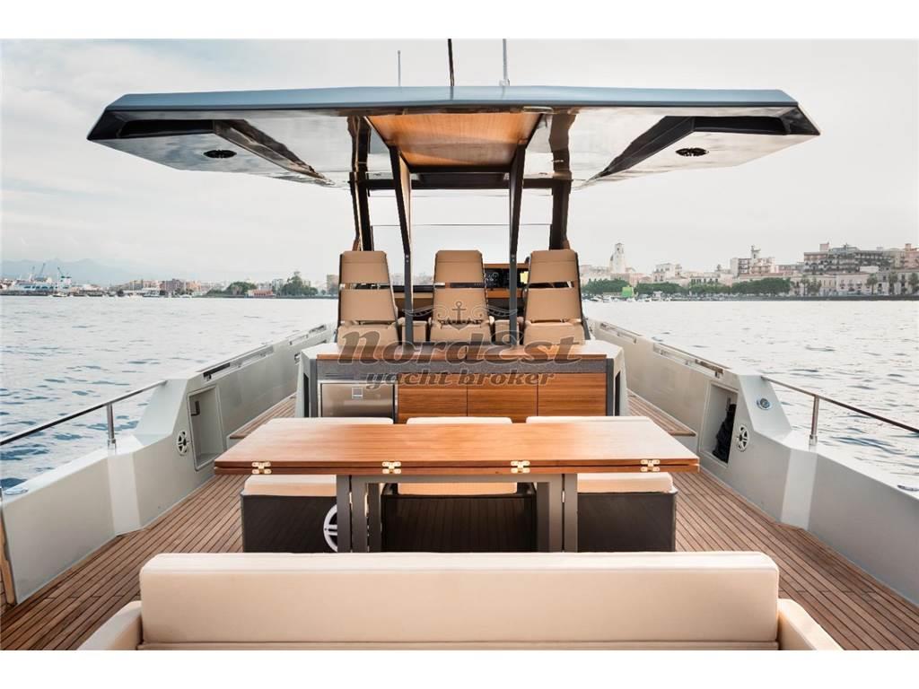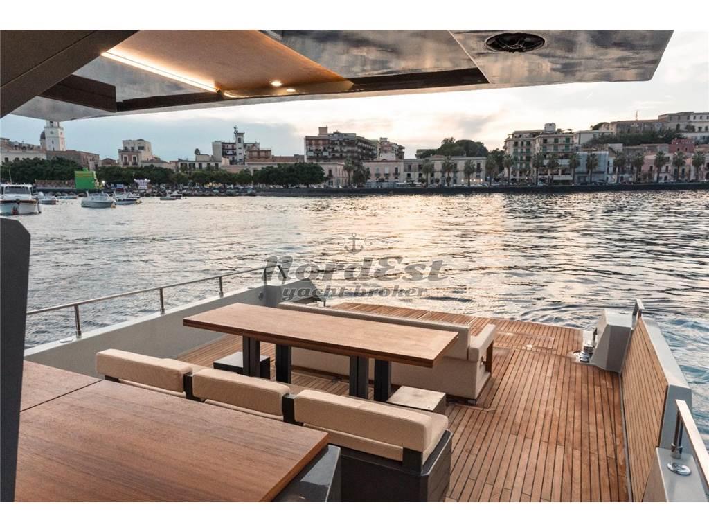 Eleganza, sportività ed essenzialità del design. Piattaforme mobili laterali pneumatiche di poppa. Tubolari laterali di protezione di nuova generazione. Hard-top di grandi dimensioni. Torrini di poppa multifunzione. Inoltre trasformabilità e possibilità di avere pluri-layout. Applicazione delle norme di EcoDesign per il disassemblaggio. Utilizzo di materiali innovativi, ecosostenibili e naturali. Applicazioni Smart Boat per il monitoraggio a distanza. GPR stratificato a mano ed in infusione, gel-coat isoftalico, stratificazione principale in resina isoftalica e per i primi strati di laminazione resina vinilestere, tessuti e rinforzi in vetroresina unidirezionale, opera morta in vetroresina e sandwich 20mm, componenti superiori in Kevlar, antivegetativa.