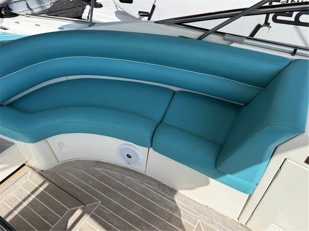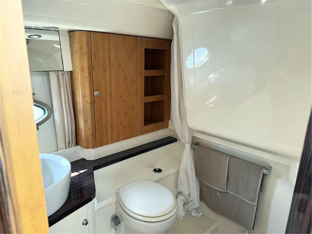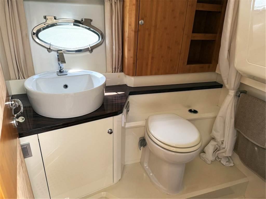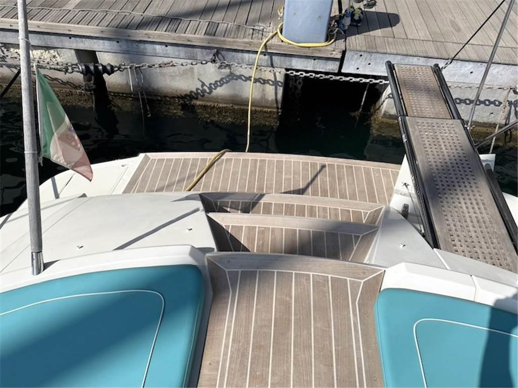Da poppa, una elegante plancetta rivestita in teak conduce, attraverso 3 comodi grandini, al pozzetto. Questo è caratterizzato dall’ampio prendisole e da due divani a C posti per murata. Proseguendo verso prua vi è la plancia di comando sulla dritta e un largo tambuccio così da rendere più arioso lo spazio interno. Scendendo sottocoperta si trovano la dinette e la cucina. A prua è collocata una grande e confortevole suite armatoriale servita da un bagno con ampia doccia. A poppa, sotto il pozzetto, è ubicata una cabina a due letti per gli ospiti con bagno dedicato